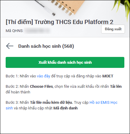 - Để xuất khẩu danh sách học sinh trong năm học đã chọn, anh/chị chọn Danh sách học sinh, nhấn Xuất khẩu danh sách học sinh để xuất khẩu dữ liệu tương ứng trên MISA EMIS. Sau đó, thực hiện tải file xuất khẩu lên CSDLQG theo hướng dẫn được hiển thị trên tiện ích.