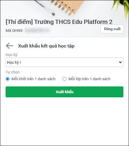 - Vào Kết quả học tập, chọn học kỳ và tùy chọn định dạng danh sách: Mỗi khối trên 1 danh sách hoặc Mỗi lớp trên 1 danh sách. Nhấn Xuất khẩu.