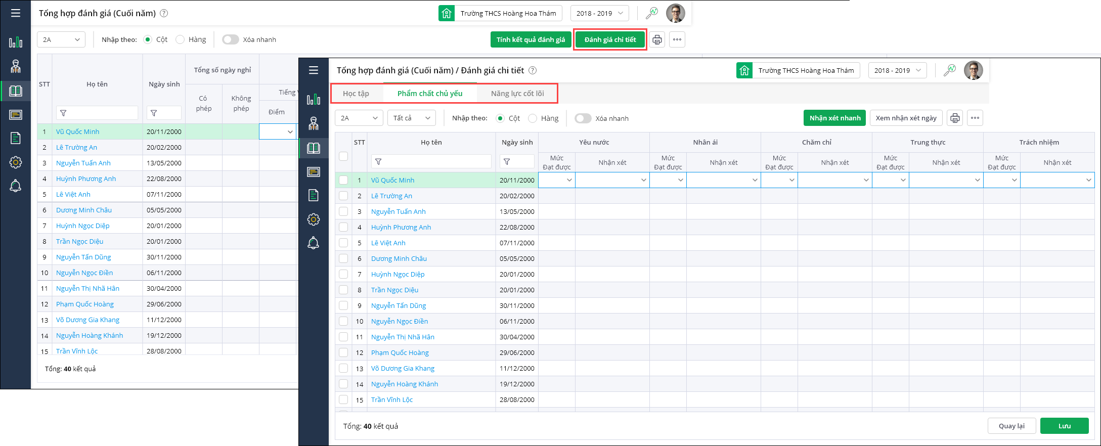 • Chọn Kỳ đánh giá, Lớp cần đánh giá. Nhấn Đánh giá chi tiết.