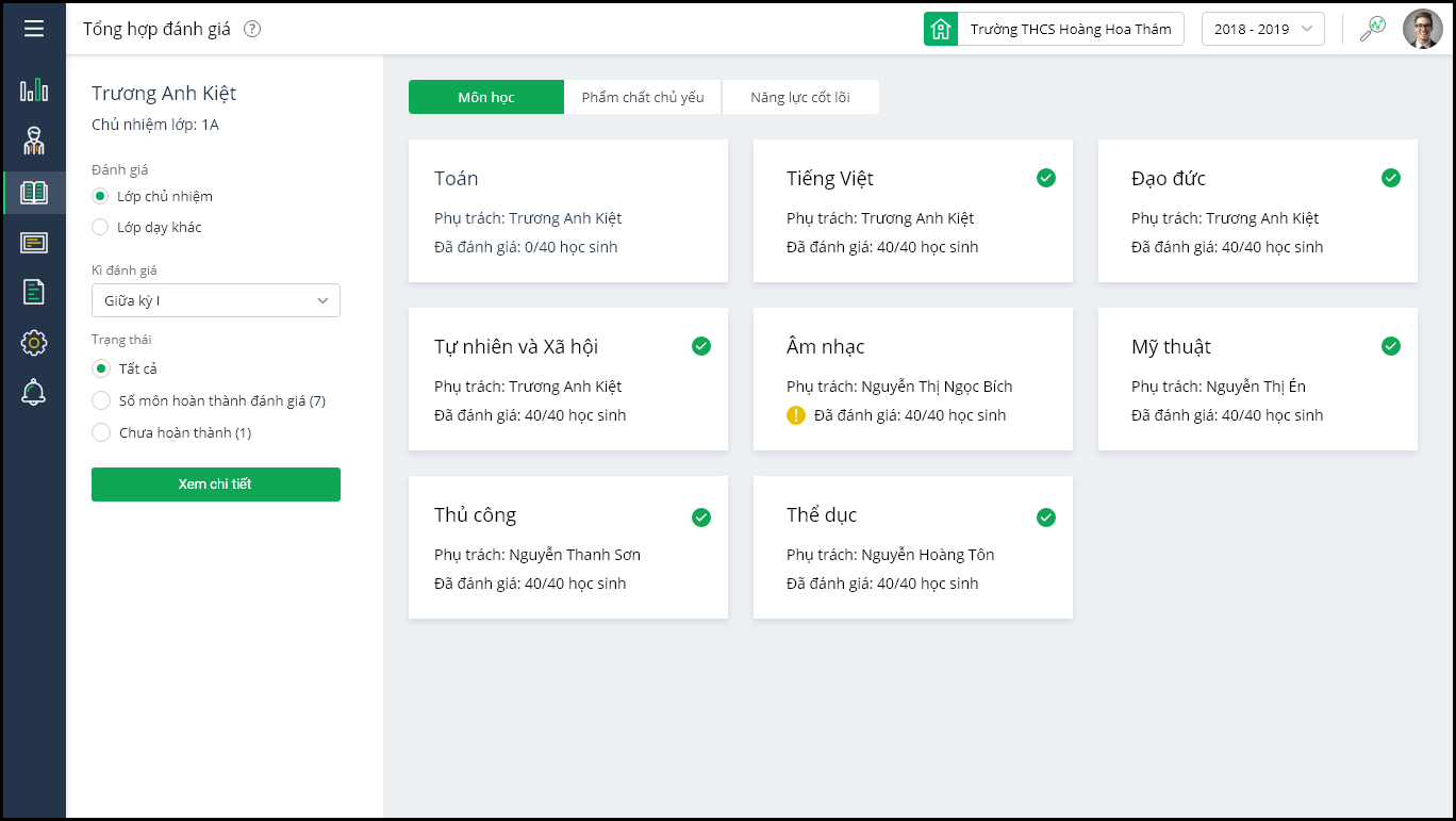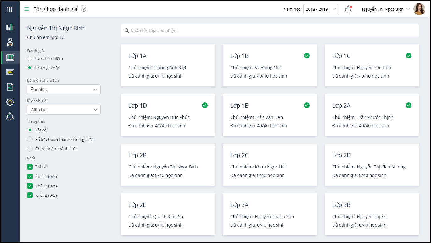 • Nếu chọn đánh giá Lớp dạy khác, GVBM có thể theo dõi và đánh giá học sinh theo môn học tại lớp mà mình phụ trách