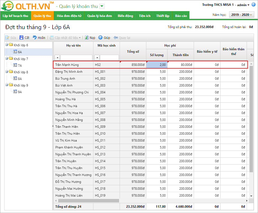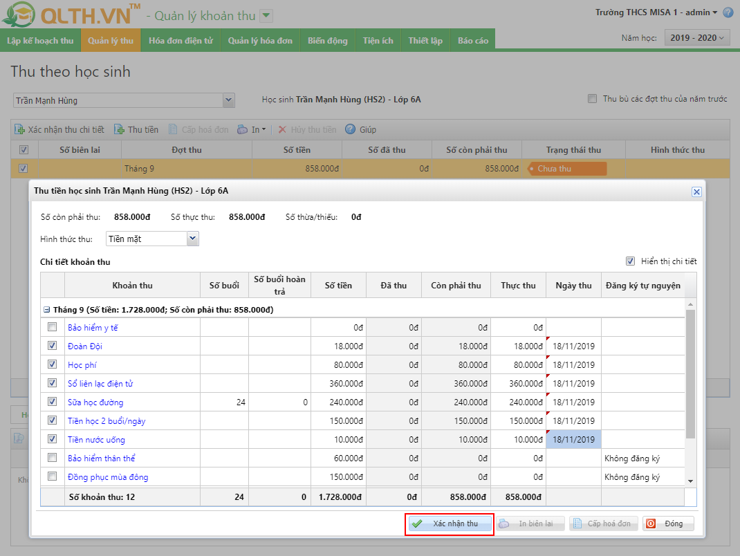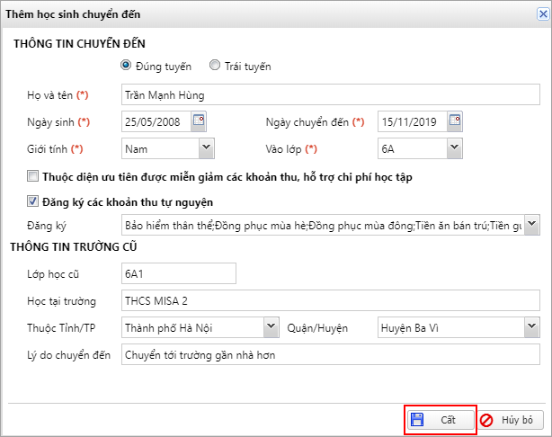 - Anh/chị thực hiện thu tiền cho học sinh mới chuyển đến.