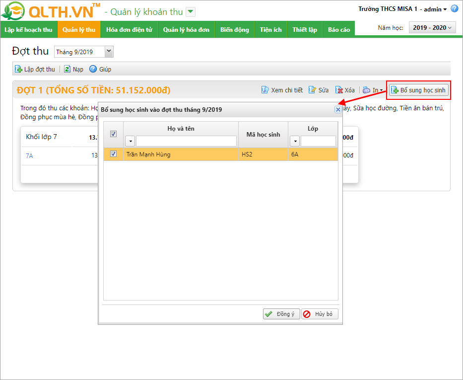 - Nhấn Bổ sung học sinh và tích chọn học sinh cần thêm vào đợt thu. Nhấn Đồng ý