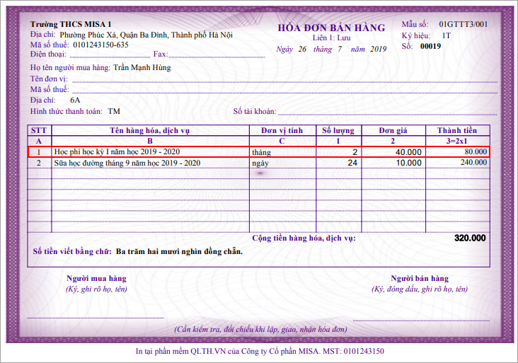 - Lưu ý: Chương trình chỉ đáp ứng thay đổi số tháng với khoản thu có Mức thu: Tháng và tần suất thu là: Học kỳ/Năm, hoặc số kỳ với khoản thu có mức thu: Học kỳ và tần suất thu là Năm.