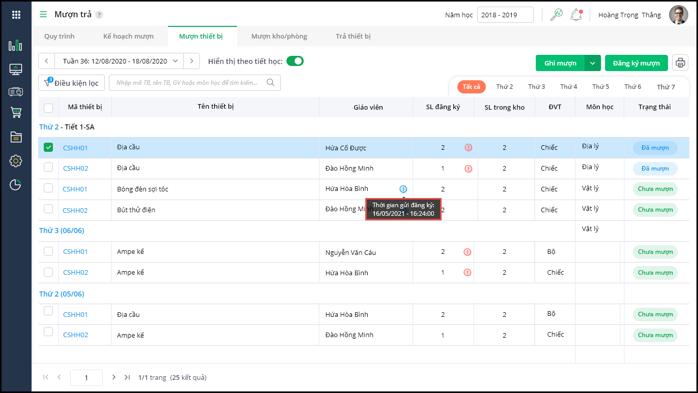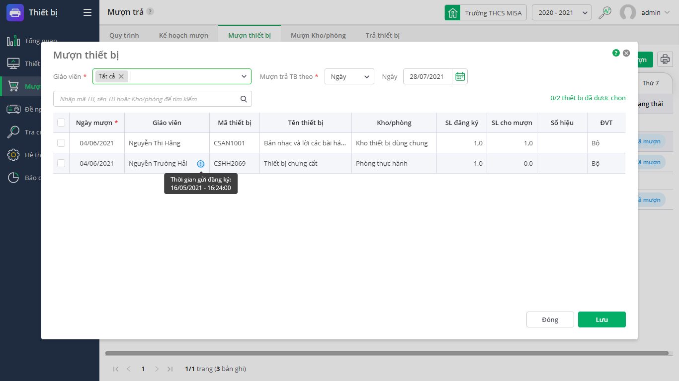 • Tại đây CBTB có thể theo dõi đăng ký mượn thiết bị của giáo viên và kiểm tra thời gian gửi đăng ký mượn.
