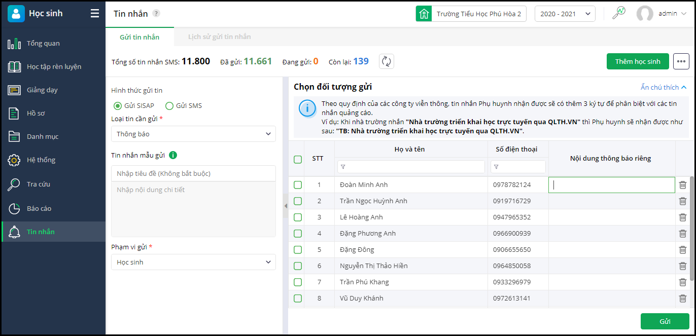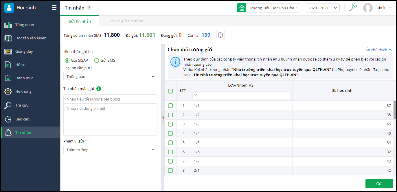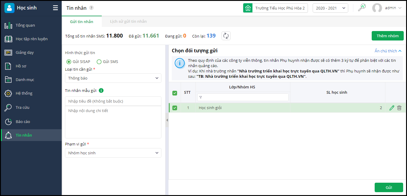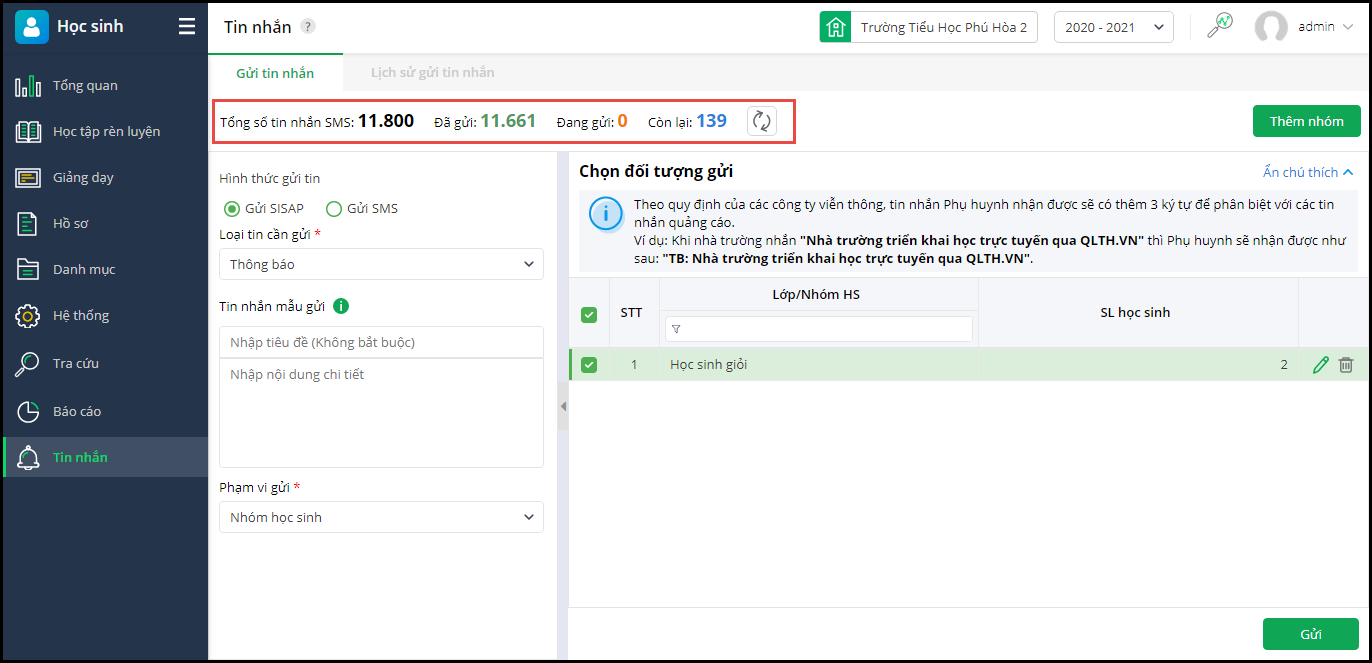 - Ngoài ra nhà trường còn có thể theo dõi tổng số tin nhắn, số tin nhắn đã gửi và số tin nhắn còn lại.