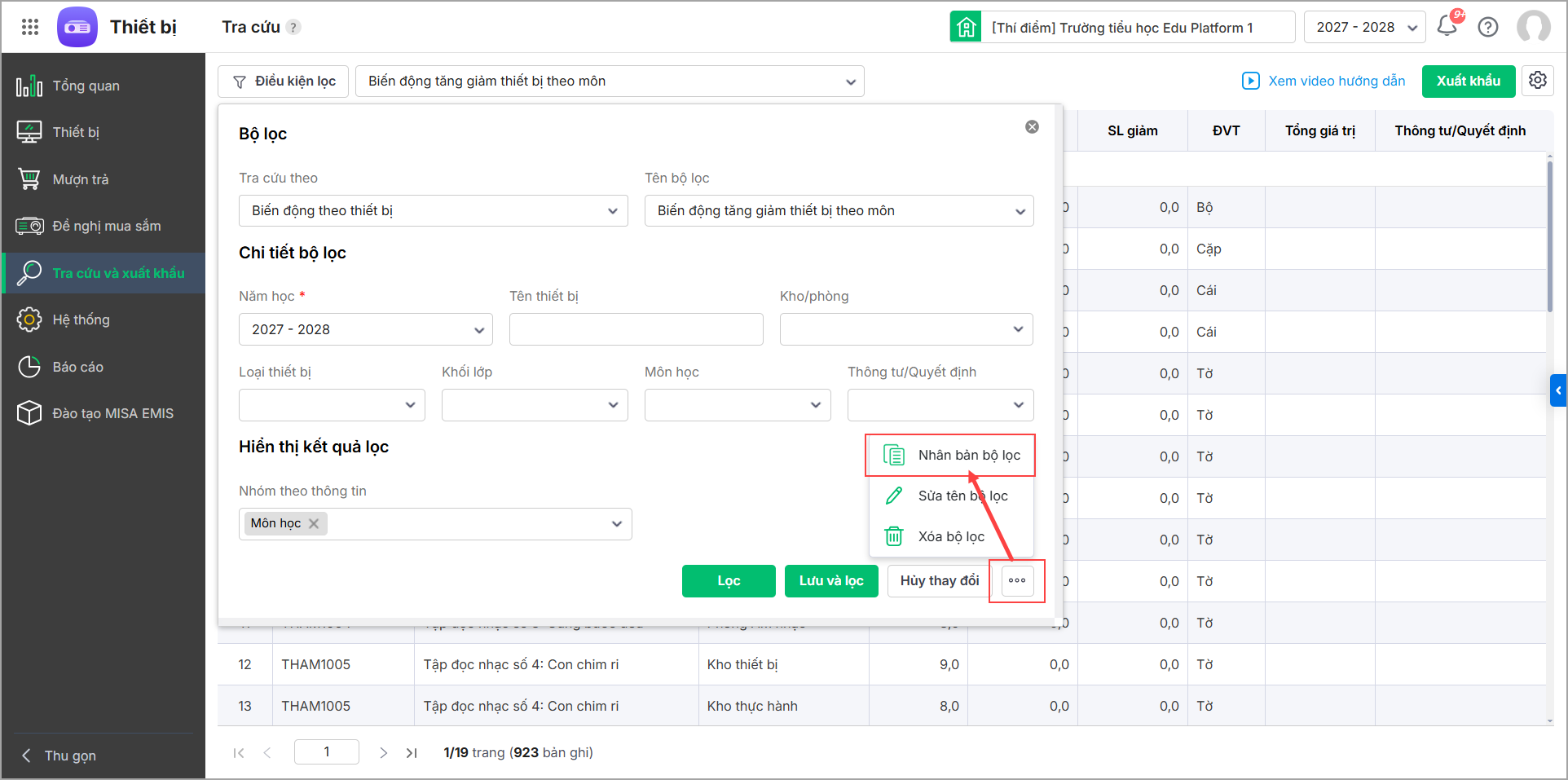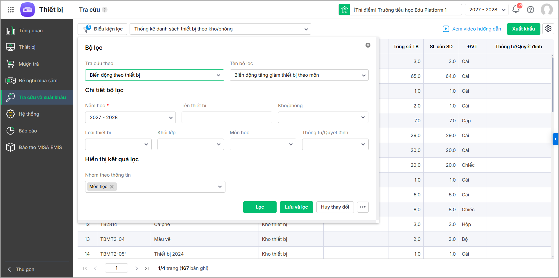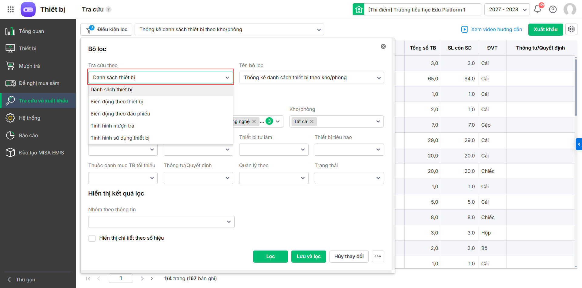 - Chi tiết bộ lọc: Chọn các giá trị lọc theo nhu cầu tra cứu theo nhu cầu: Năm học, Tên thiết bị, Môn học, Kho/phòng, Loại thiết bị, Khối lớp, Môn học