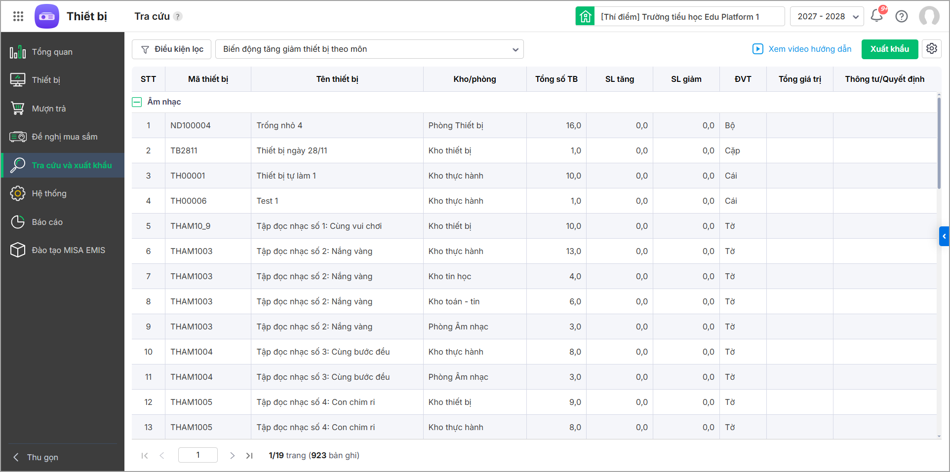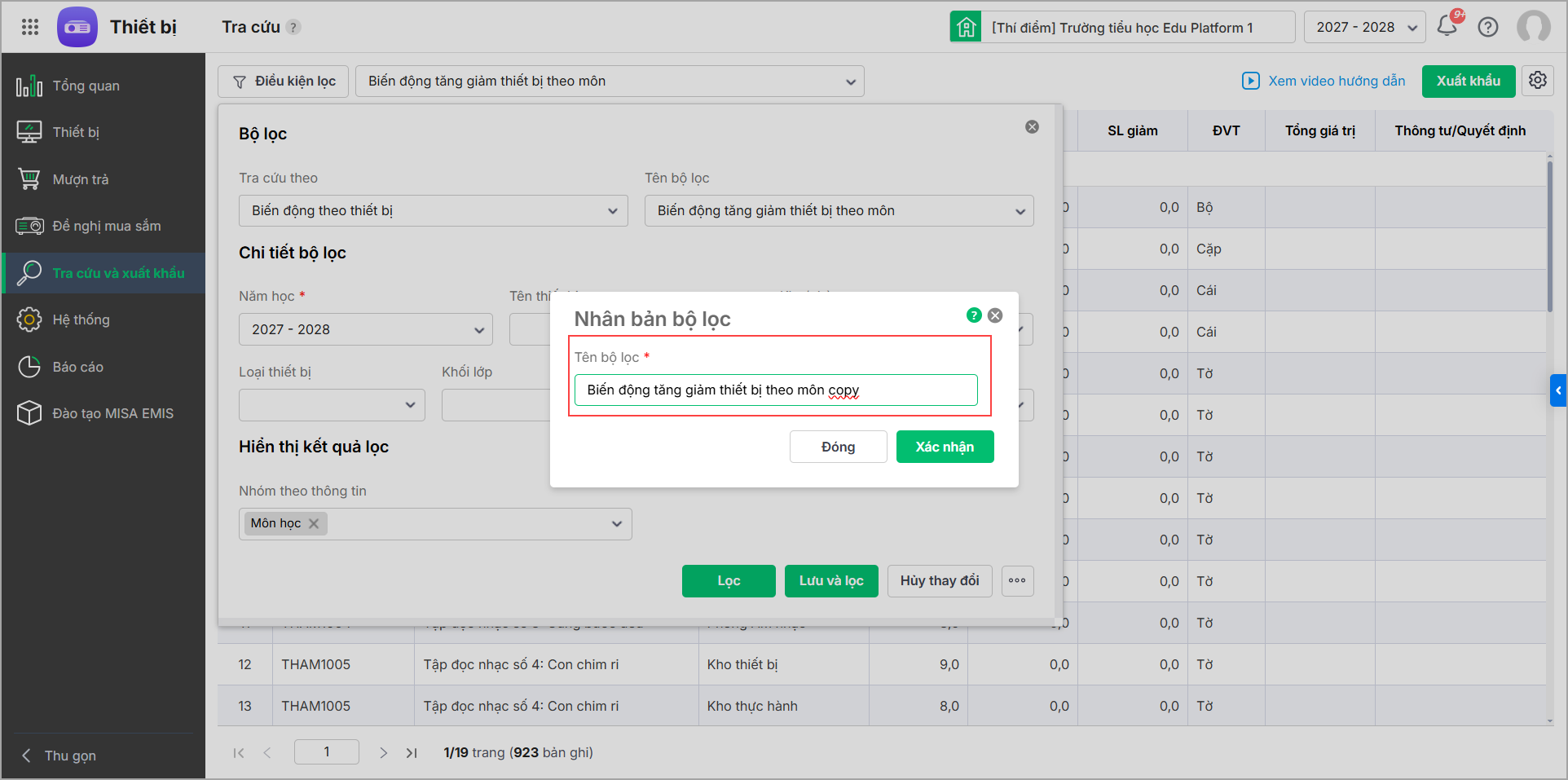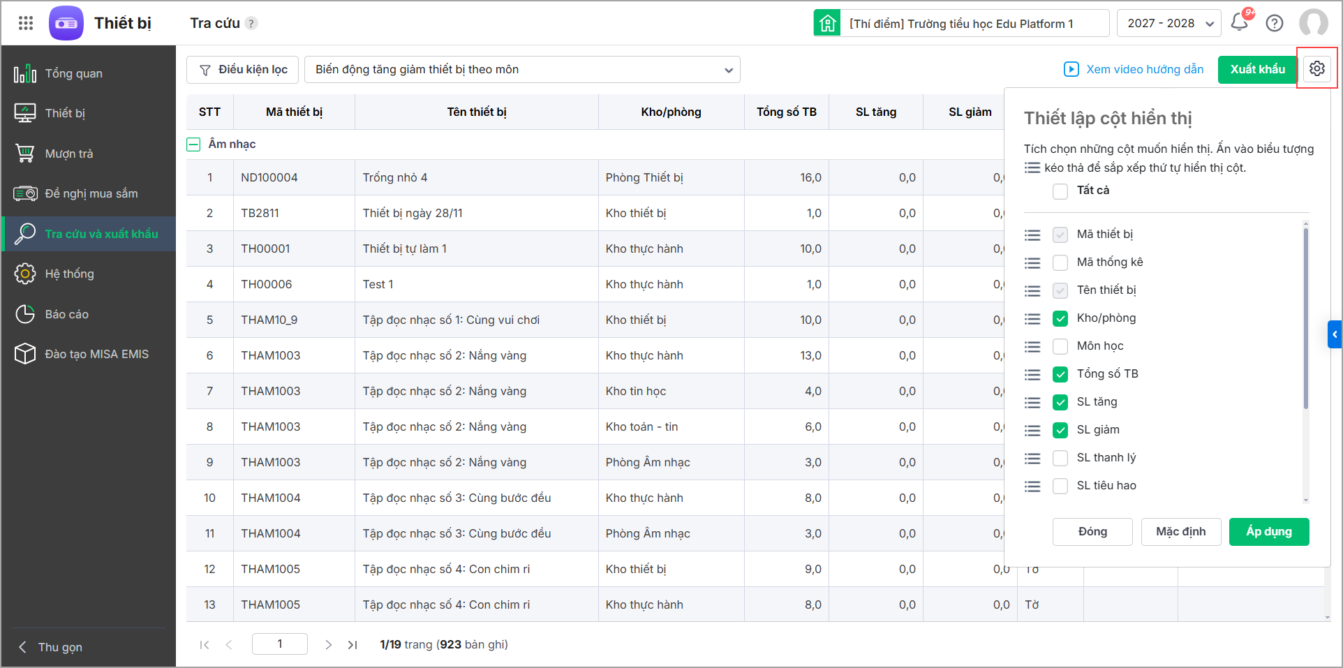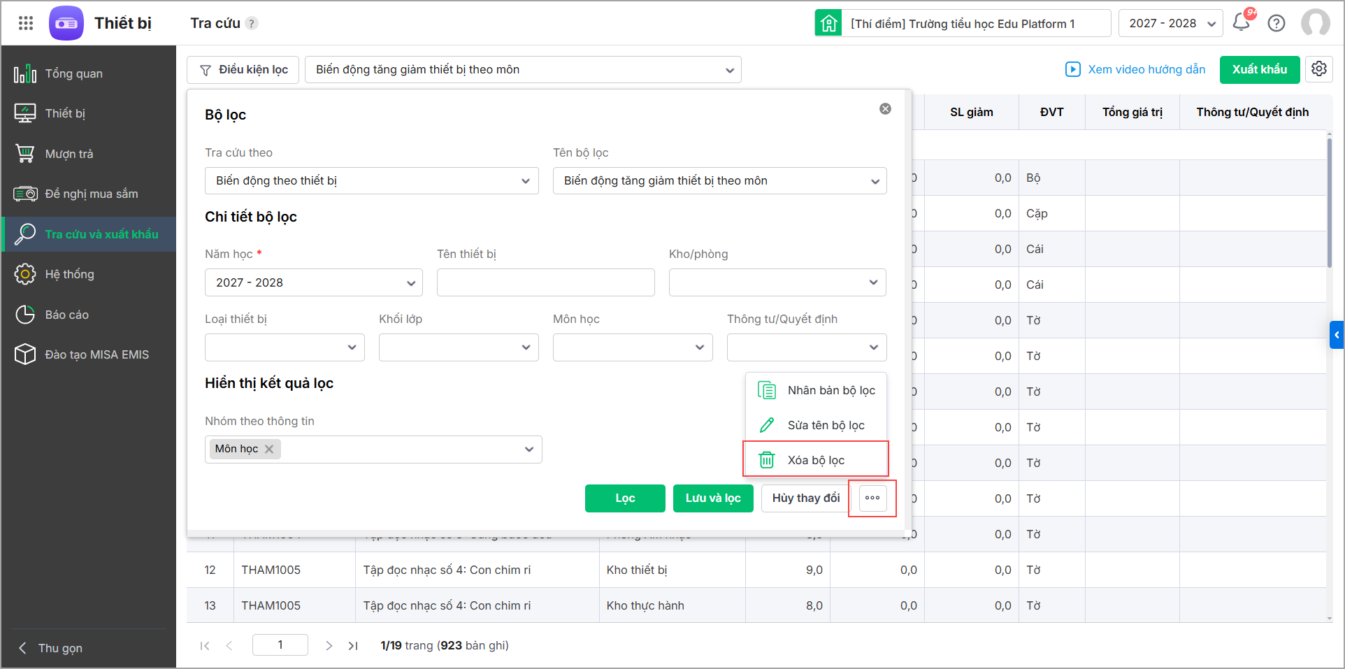- Chi tiết bộ lọc: Chọn các giá trị lọc theo nhu cầu tra cứu theo nhu cầu: Năm học, Tên thiết bị, Môn học, Kho/phòng, Loại thiết bị, Khối lớp, Môn học
