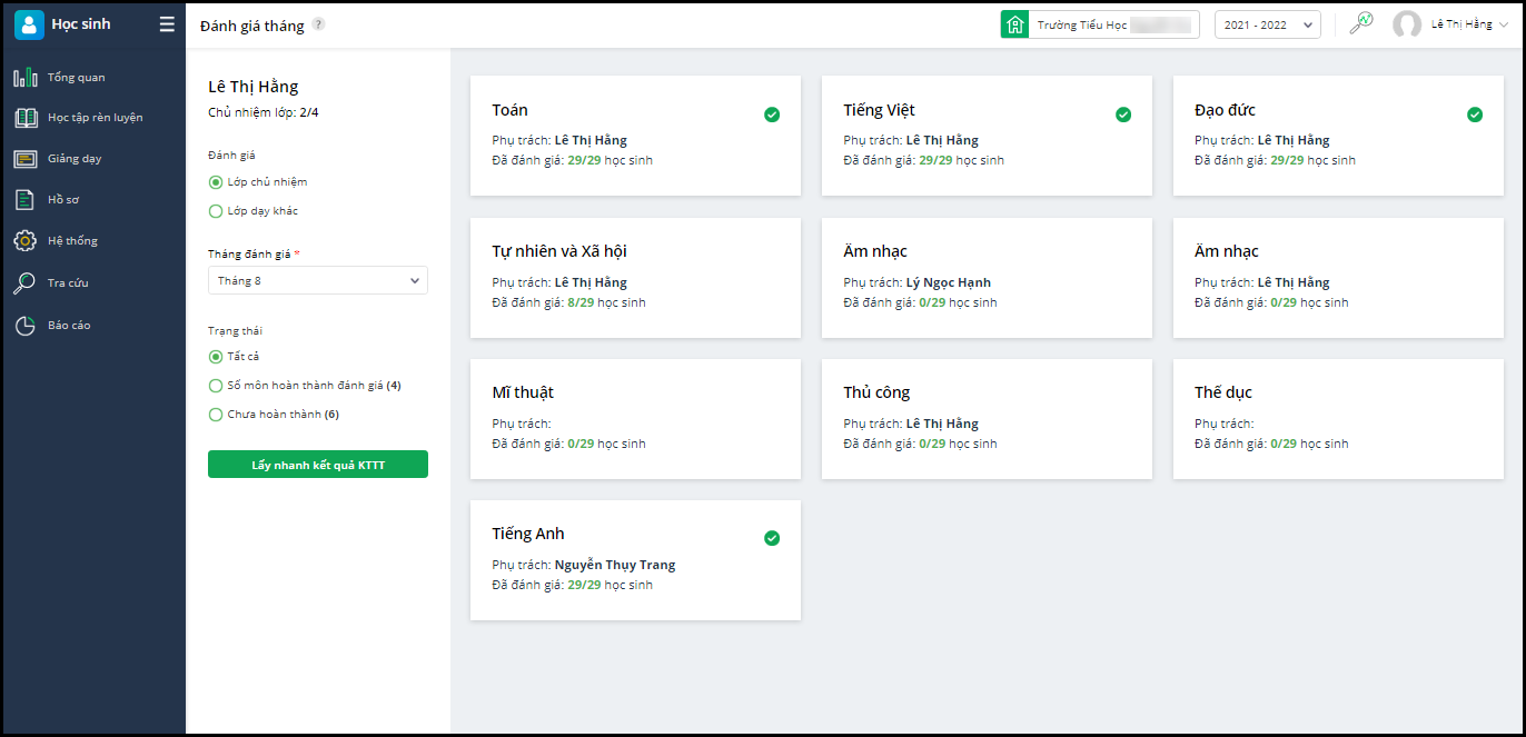 Mục đích: Giúp giáo viên tổ chức và đánh giá chất lượng học tập của học sinh theo tháng, kịp thời nắm bắt kết quả học tập và gửi thông tin cho phụ huynh.