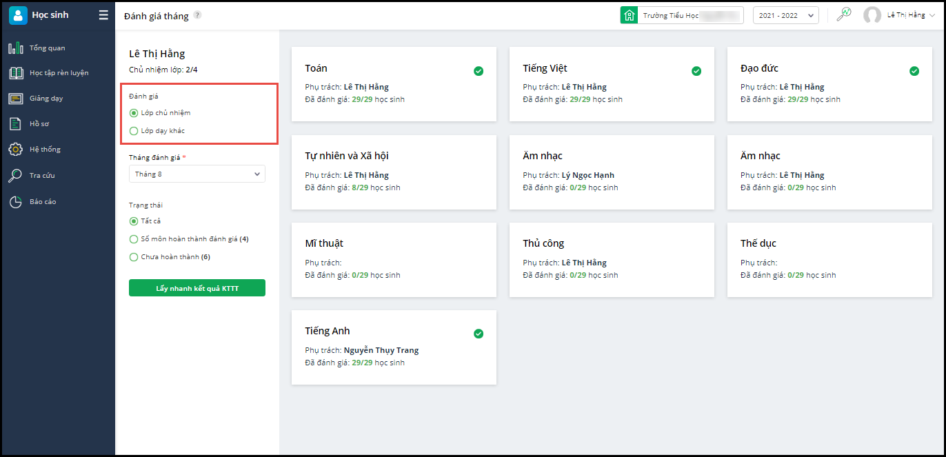 - GVCN có thể chọn đánh giá học sinh theo từng môn trong Lớp chủ nhiệm hoặc đánh giá học sinh Lớp dạy khác khi được phân công thêm vai trò giáo viên bộ môn.