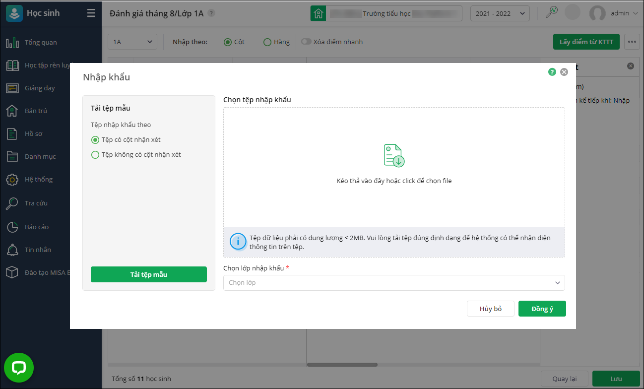 - Tải tệp mẫu đã có dữ liệu lên chương trình. Chọn lớp để nhập khẩu dữ liệu. Nhấn Đồng ý để xác nhận nhập khẩu.