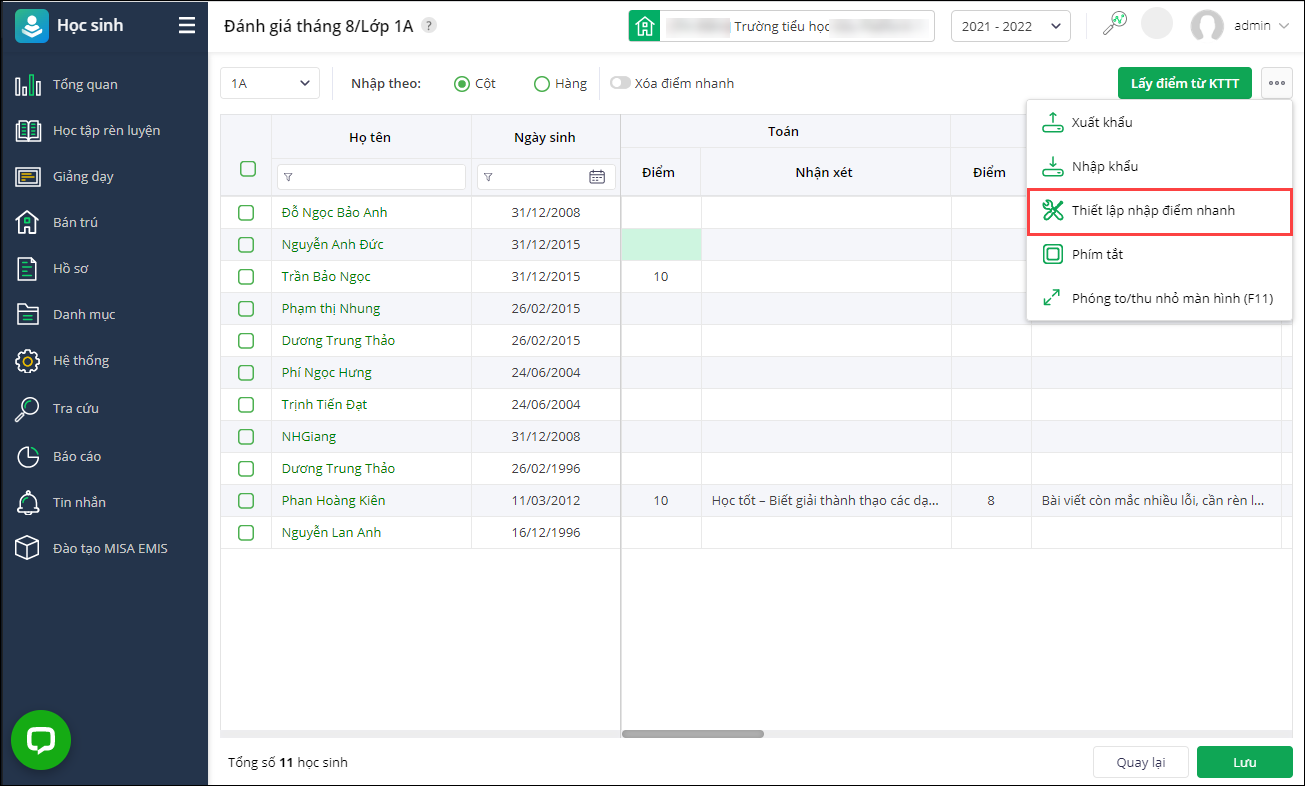 - Thiết lập thông tin để hỗ trợ nhập điểm nhanh: