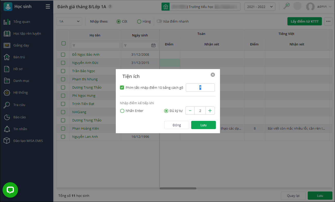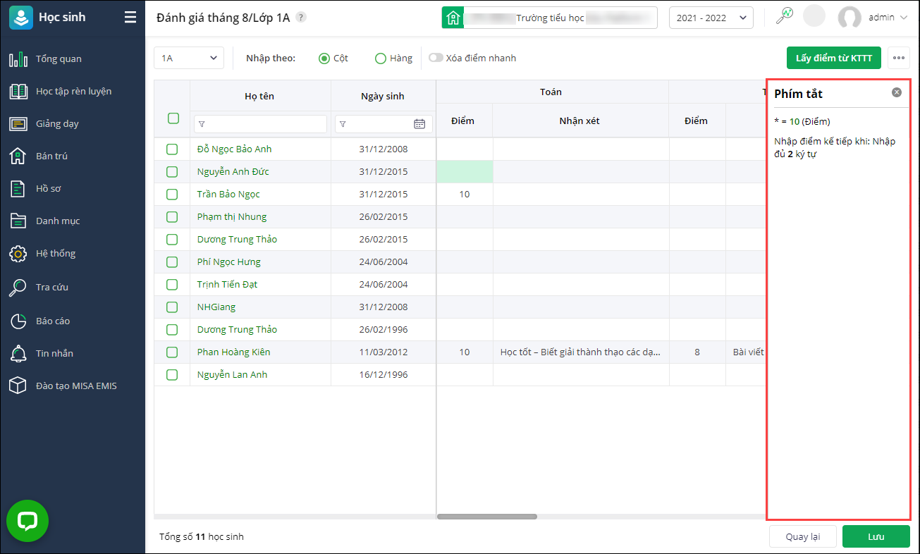 - Phím tắt nhập điểm 10: Thay vì nhập điểm 10 , thầy cô có thể thay thế bằng cách nhập một ký tự khác được thiết lập giúp tiết kiệm thời gian.