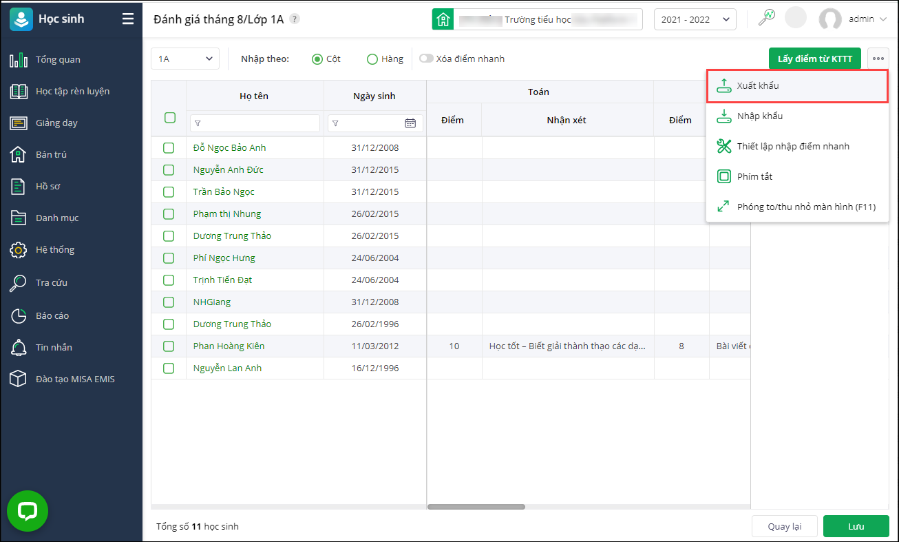 Các đơn vị sử dụng đồng thời EMIS – Ôn tập và EMIS – Học sinh có thể thực hiện đánh giá chất lượng học tập của học sinh theo tháng.