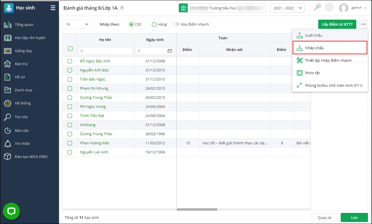 - Tải tệp mẫu đã có dữ liệu lên chương trình. Chọn lớp để nhập khẩu dữ liệu. Nhấn Đồng ý để xác nhận nhập khẩu.