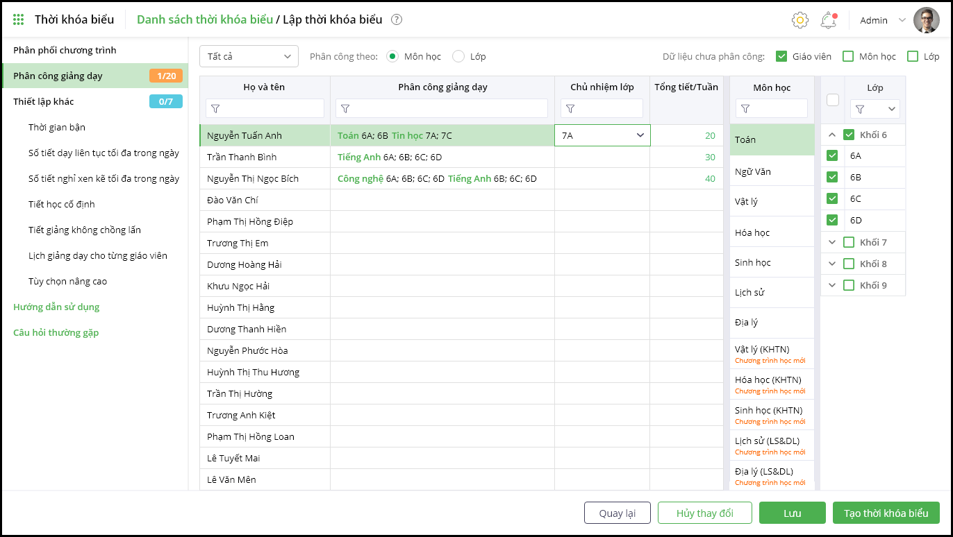 - Tại bước Thiết lập ràng buộc, anh chị chọn Phân công giảng dạy. Tại đây, anh/chị thực hiện khai báo phân công giảng dạy cho các giáo viên trong trường. Thực hiện phân công theo Lớp hoặc theo Môn học.
