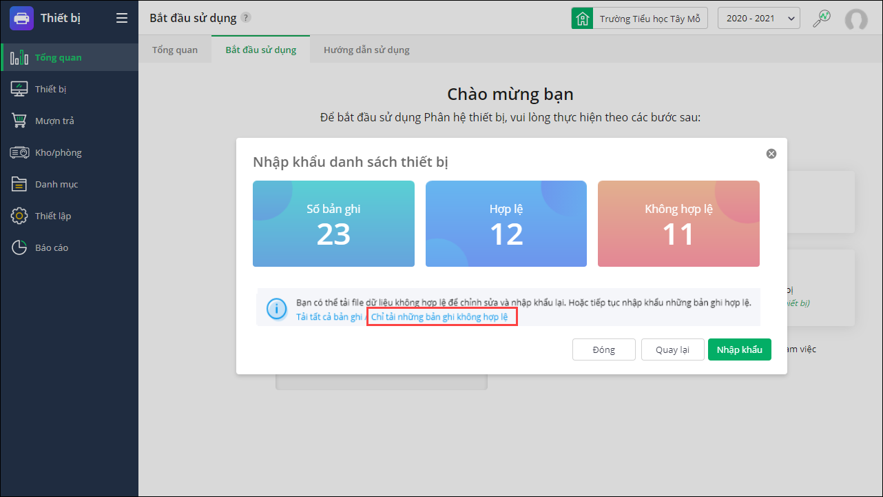 Nhấn Tải tất cả bản ghi để xem toàn bộ danh sách bản ghi (bao gồm bản ghi hợp lệ và bản ghi không hợp lệ) hoặc Chỉ tải những bản ghi không hợp lệ và thực hiện chỉnh sửa, nhập khẩu lại vào phần mềm. - Nhấn Nhập khẩu để nhập khẩu bản ghi thông tin thiết bị hợp lệ vào phần mềm.