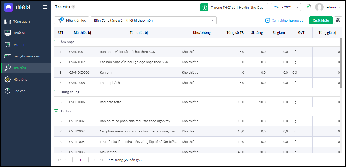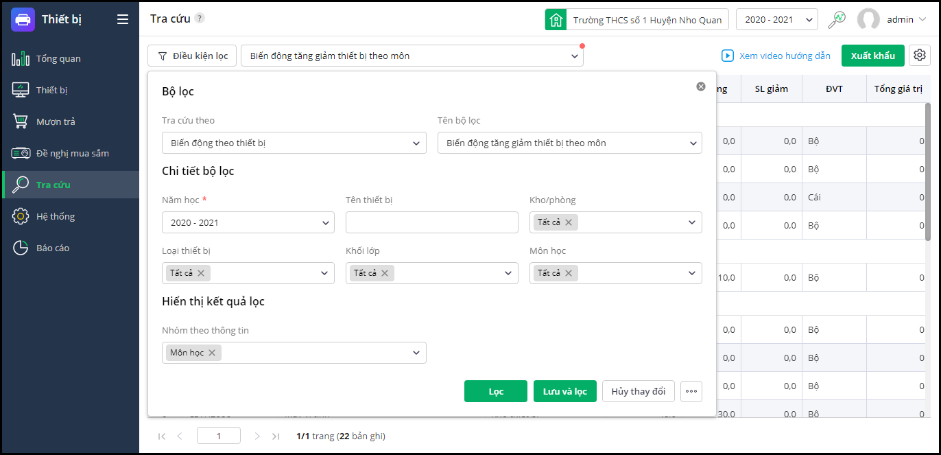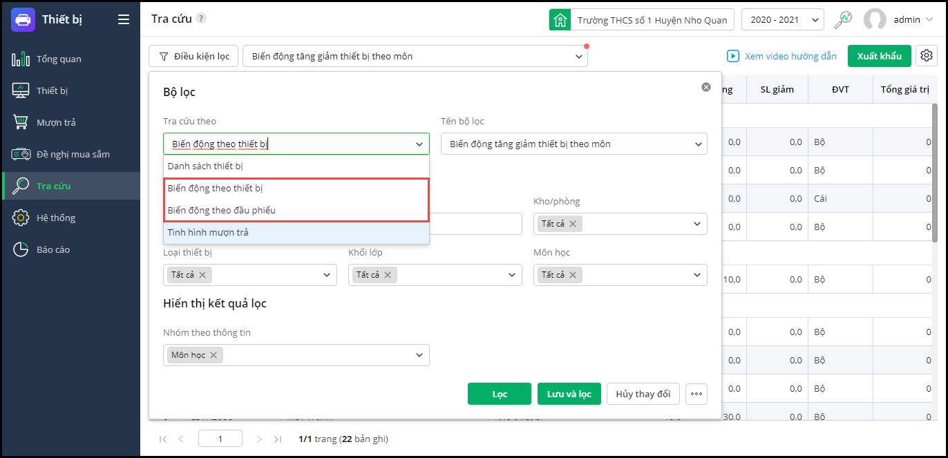 4. Chi tiết bộ lọc: Chọn các giá trị lọc theo nhu cầu tra cứu theo nhu cầu: Năm học, Tên thiết bị, Môn học, Kho/phòng, Loại thiết bị, Khối lớp, Môn học