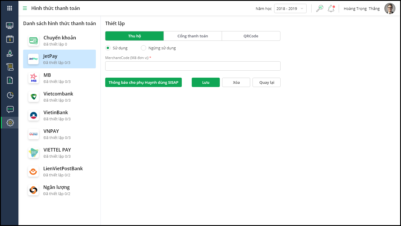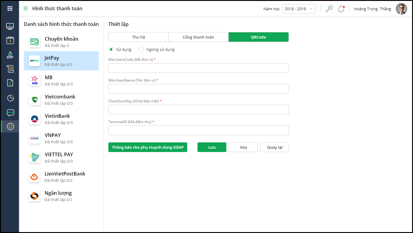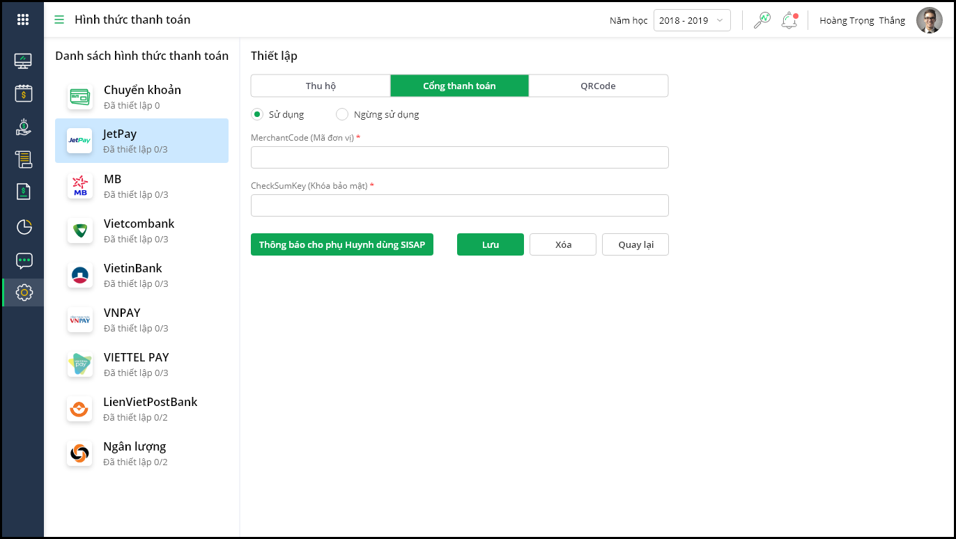 Nhà trường chủ động thiết lập các thông tin thanh toán qua JETPAY.