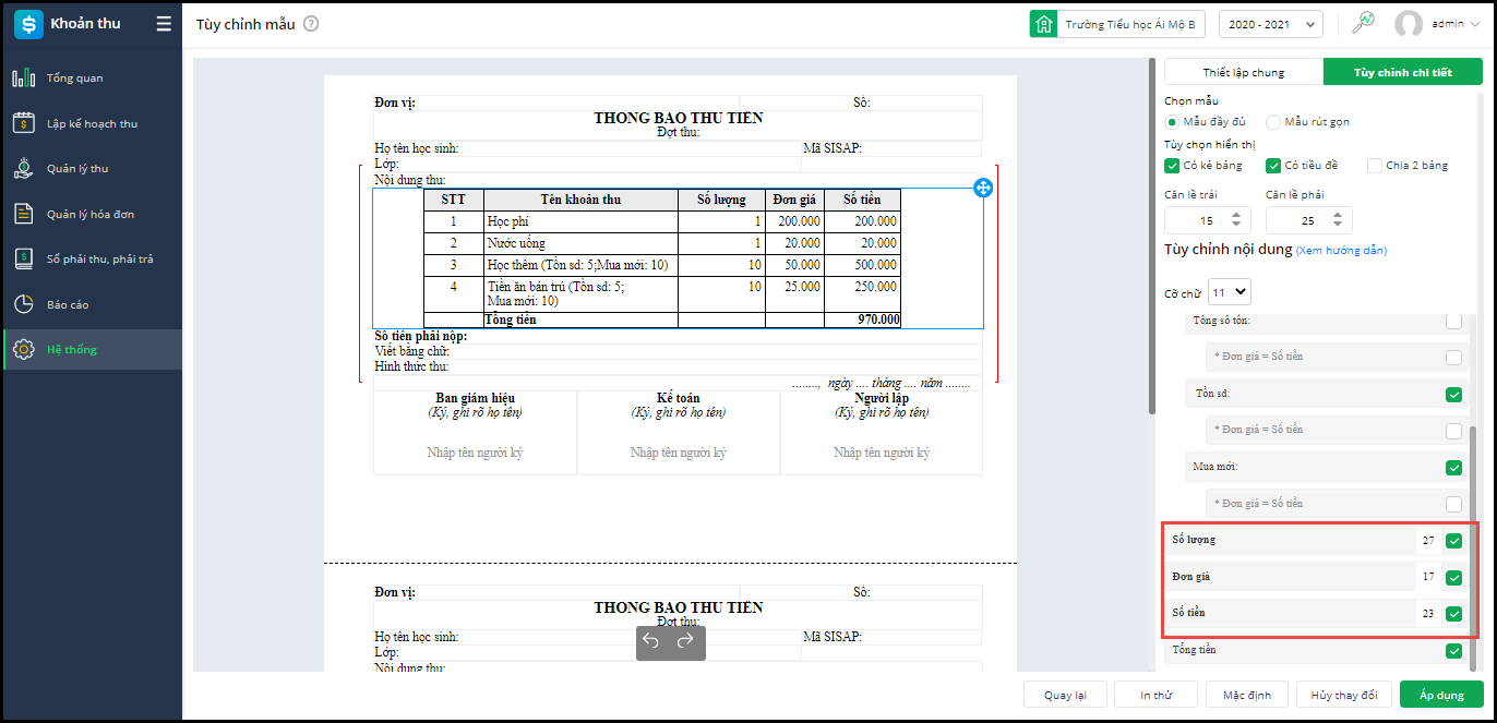 • Tích chọn để hiển thị các nội dung tương ứng. Kế toán tùy chỉnh thông tin bảng kê thu tiền: STT, số lượng, đơn giá tại đây.