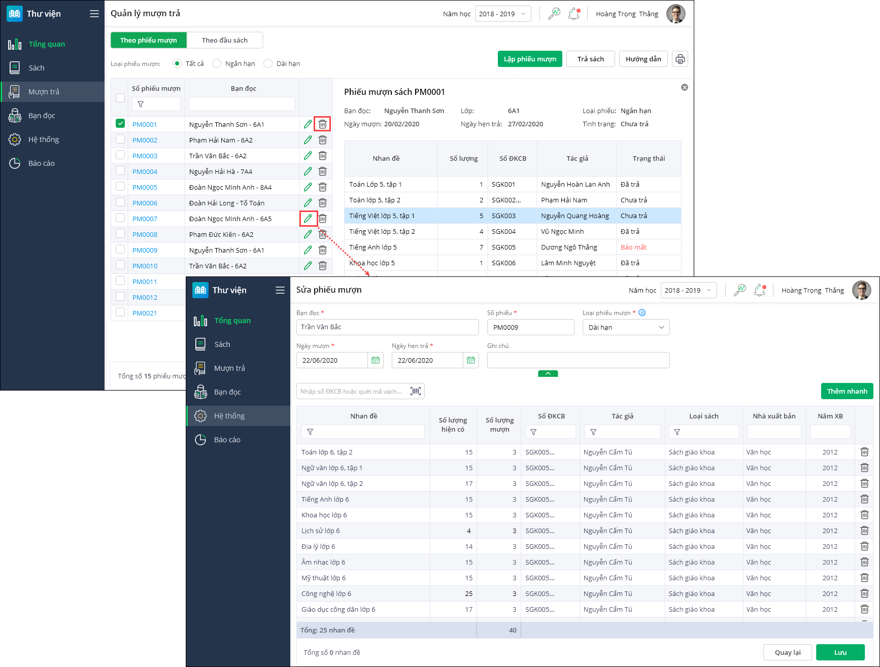 - Các phiếu mượn đã lập có thông tin chưa chính xác hoặc không muốn theo dõi có thể Sửa/Xóa để quản lý theo đúng thực tế bằng cách nhấn vào biểu tượng Bút/Thùng rác tương ứng