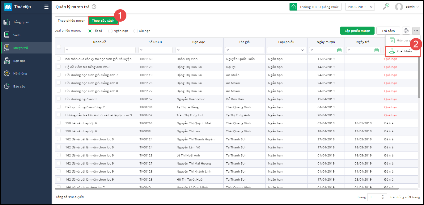 - CBTV có thể xuất khẩu danh sách mượn sách để thống kê và tổng hợp số liệu theo nhiều tiêu chí bằng cách chọn Xem theo đầu sách, vào Tiện ích/Xuất khẩu