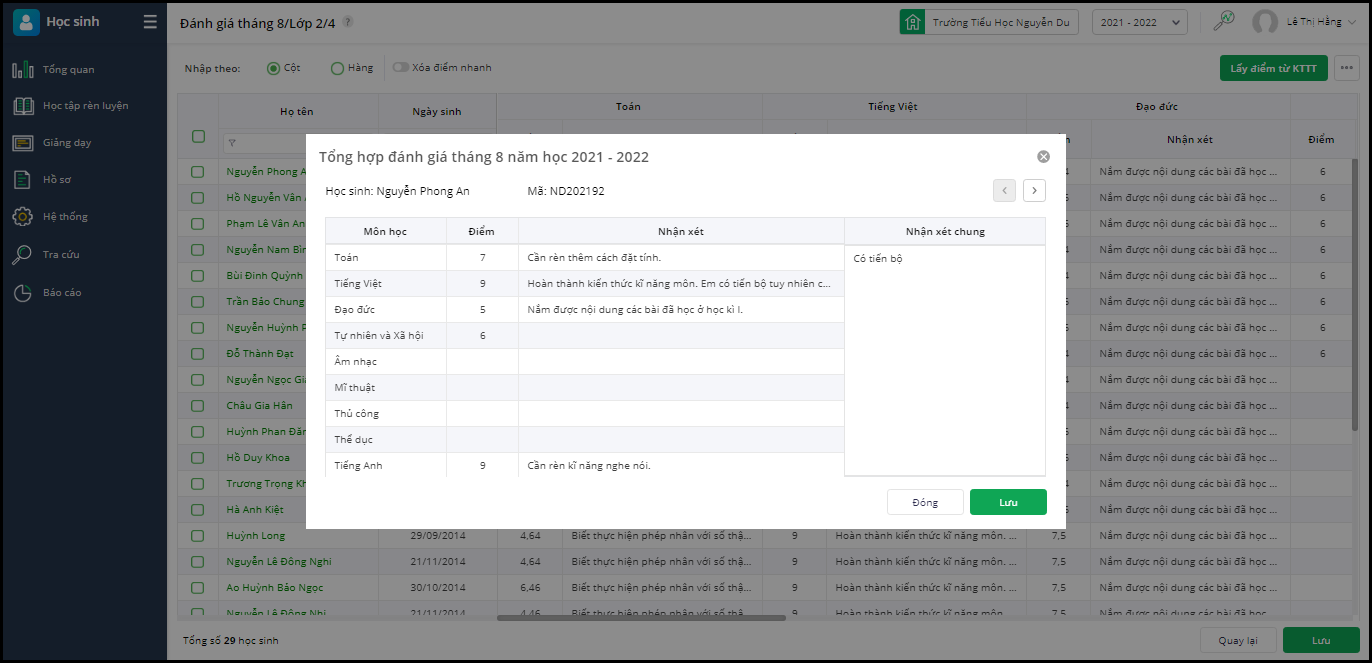 - Hoặc nhấn vào tên học sinh để tổng hợp đánh giá nhanh cho học sinh: Nhập điểm và nhận xét cho từng môn học, nhận xét chung cho kết quả học tập của tháng.