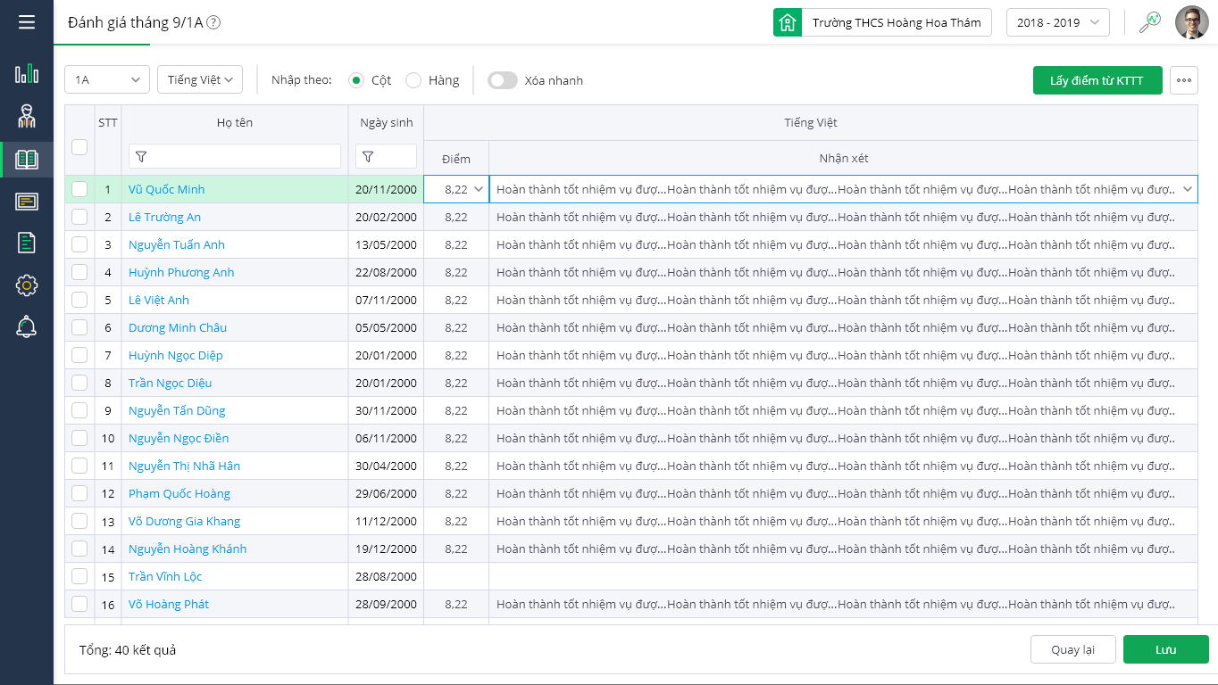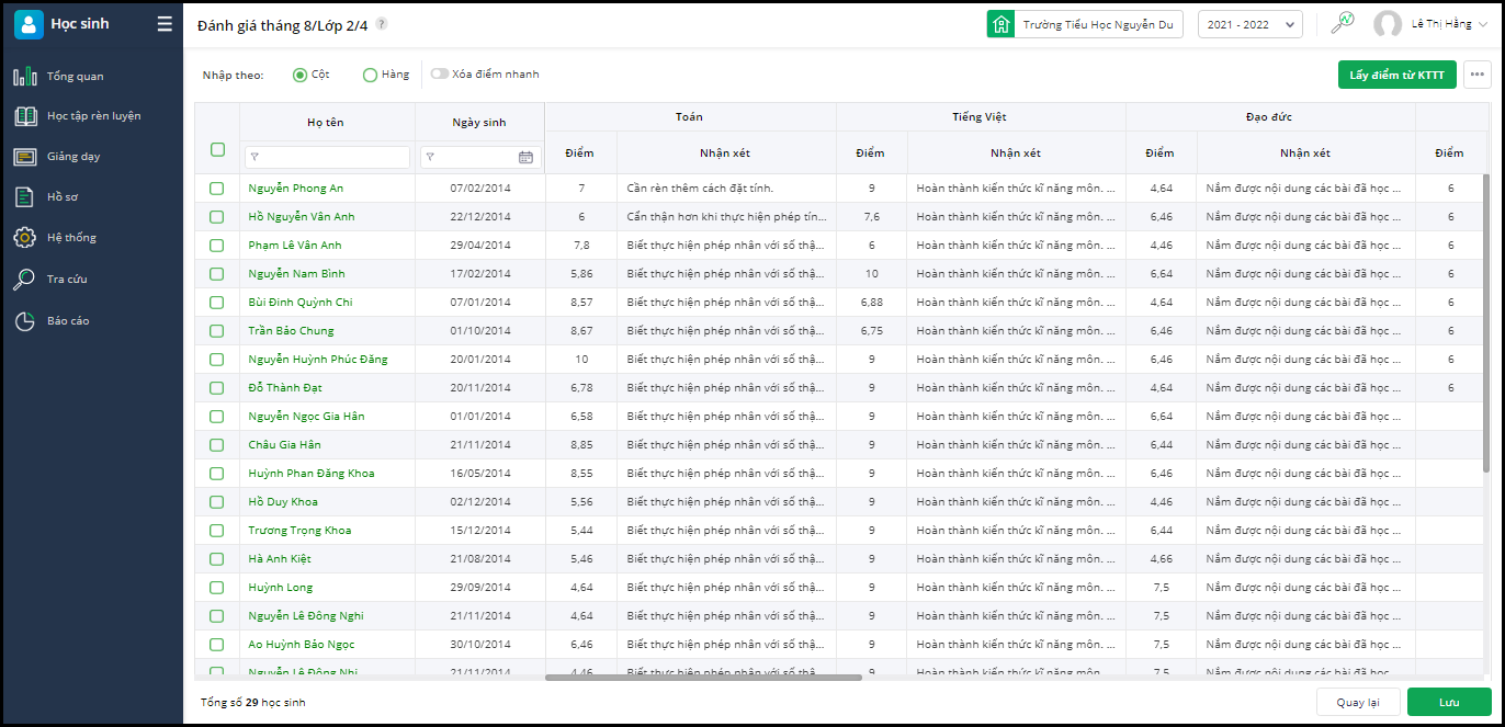 - Thực hiện đánh giá cho từng học sinh ngay tại màn hình Đánh giá tháng của lớp đã chọn