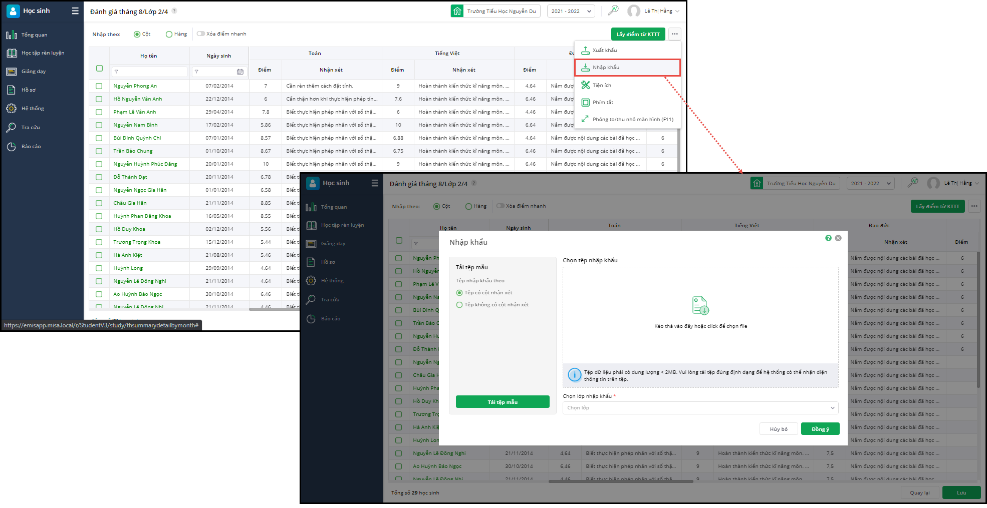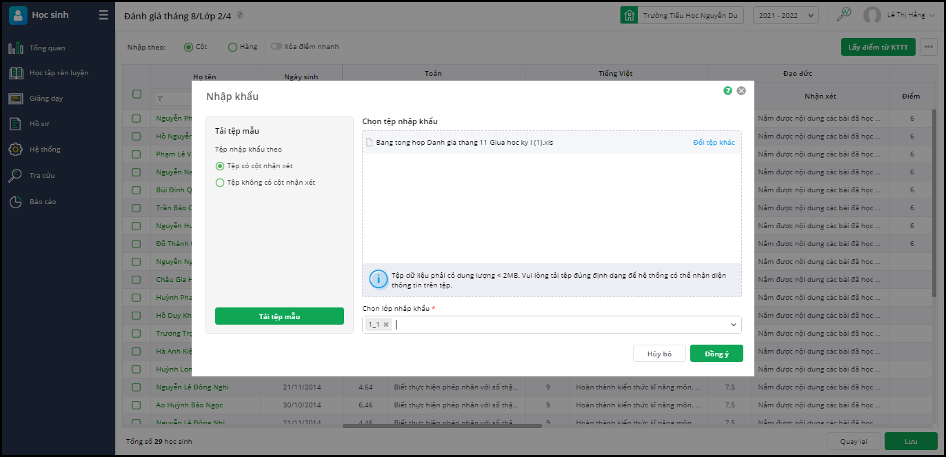 - Tải tệp mẫu đã có dữ liệu lên chương trình. Chọn lớp để nập khẩu dữ liệu. Nhấn Đồng ý để xác nhận nhập khẩu.