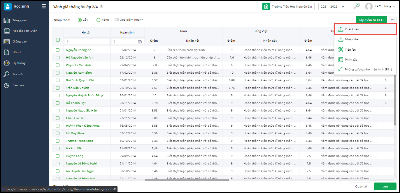 - Để xuất khẩu đánh giá tháng đang quản lý trên chương trình, Vào dấu “…”, chọn Xuất khẩu.