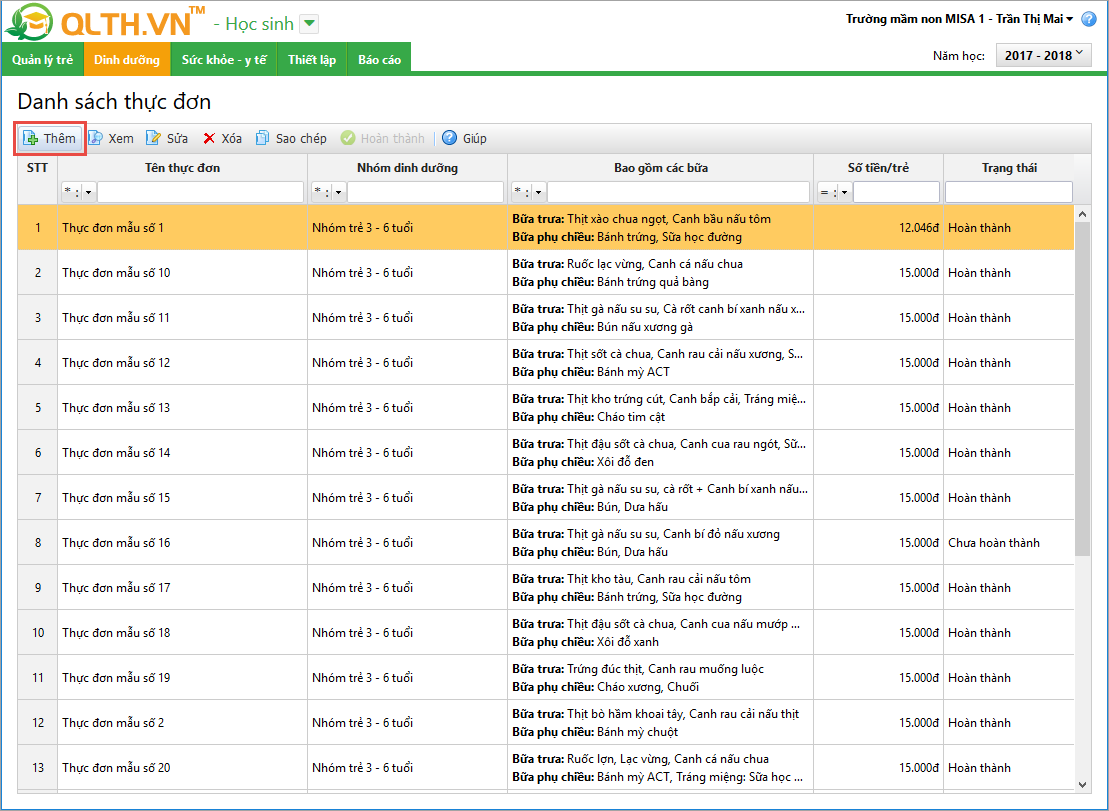 - Hệ thống đã cung cấp sẵn thư viện danh sách thực phẩm sử dụng để lập thực đơn ăn cho học sinh tại Dinh dưỡng\Danh sách thực phẩm, tuy nhiên anh/chị vẫn có thể thêm các thực phẩm mới để bổ sung vào nguồn danh sách thực phẩm có sẵn này. Thao tác chi tiết xem tại Quản lý danh sách thực phẩm.