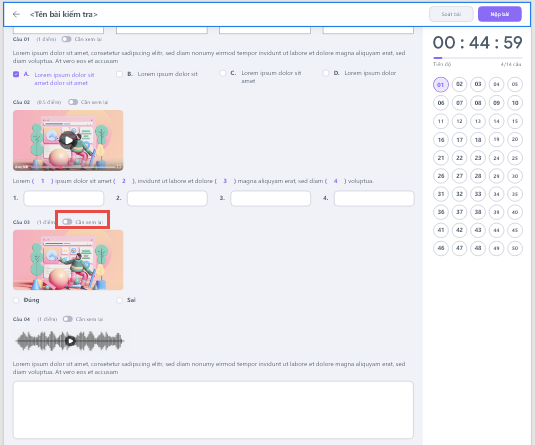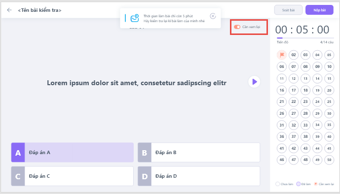 - Với những câu đã làm nhưng chưa chắc chắn, học sinh có thể đánh dấu để xem lại bằng cách nhấn vào Cần xem lại ở câu tương ứng. Đồng thời học sinh nắm bắt được số câu đã làm, chưa làm.