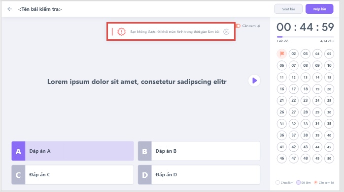 - Trong thời gian làm bài kiểm tra, nếu học sinh vào các trình duyệt khác, chương trình sẽ hiển thị thông báo.