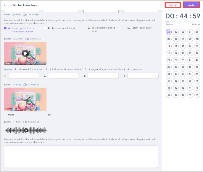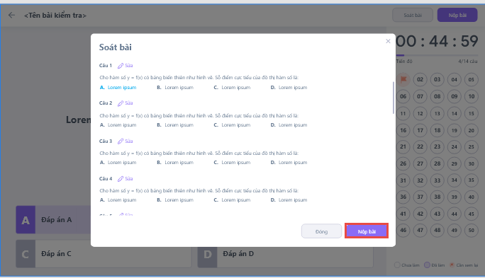 - Sau khi hoàn thiện bài, học sinh có thể soát lại bằng cách nhấn vào Soát bài để kiểm tra toàn bộ bài và sửa lại nếu cần. Học sinh nhấn Nộp bài để nộp bài trước khi hết giờ hoặc bài sẽ tự động nộp khi giáo viên đóng đề hay hết giờ.