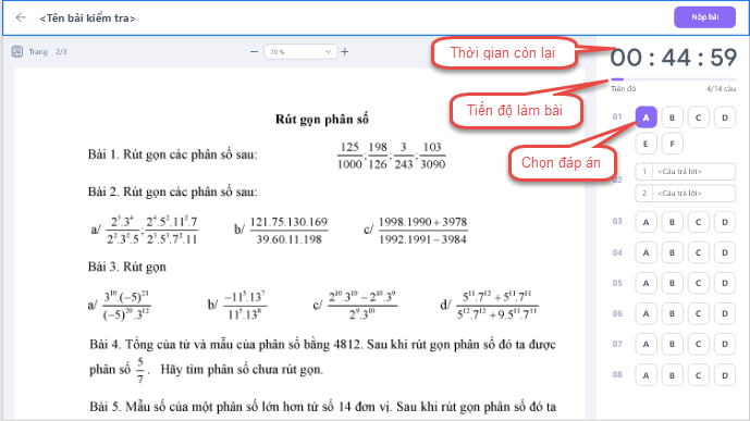 - Khi giáo viên tải đề lên, học sinh nhập lần lượt từng đáp án theo câu hỏi tương ứng trong đề kiểm tra.Đồng thời khi học sinh làm bài, chương trình sẽ tự động cập nhật Tiến độ làm bài. Để kiểm soát thời gian làm bài, học sinh sẽ theo dõi thời gian còn lại tính cho đến thời điểm bài kiểm tra kết thúc.