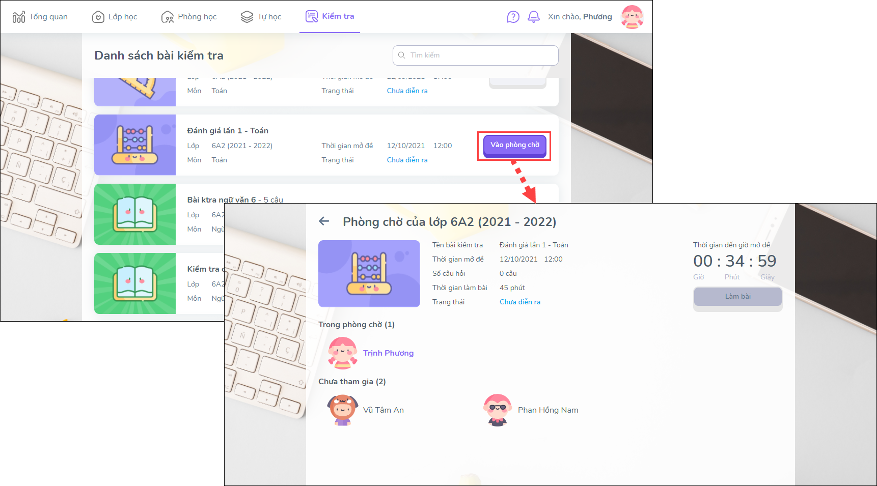 Học sinh vào phòng chờ sẵn để đợi đến thời gian làm bài bằng cách nhấn Vào phòng chờ