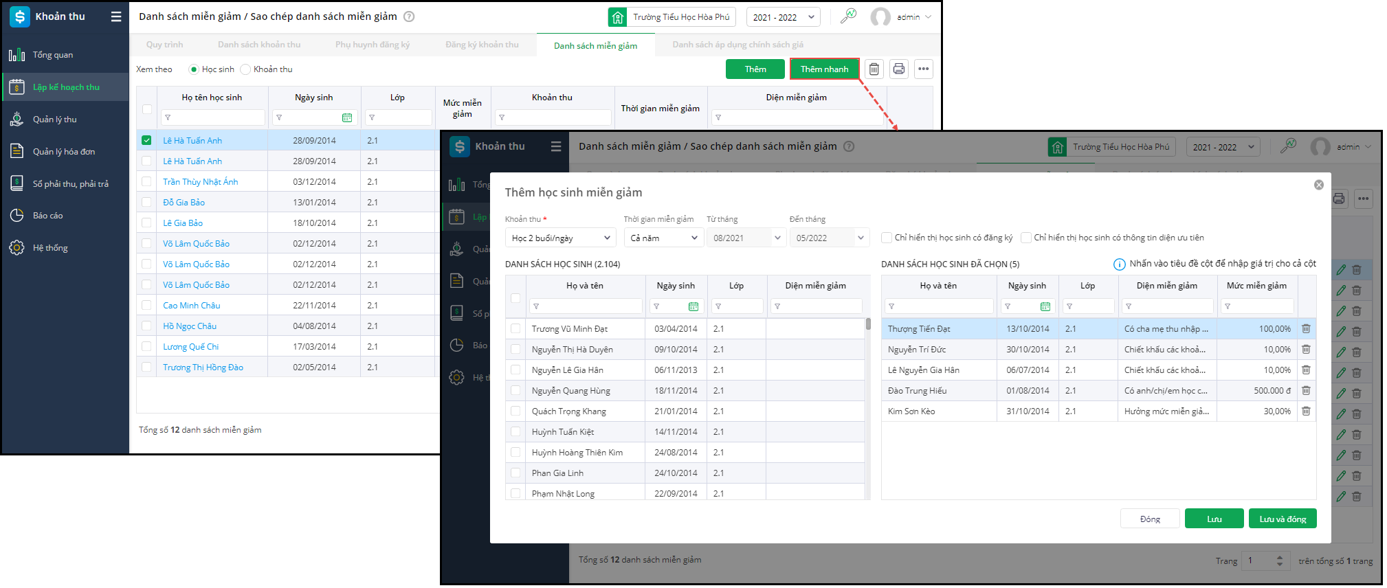 - Nhấn Thêm nhanh để thêm nhanh danh sách học sinh được miễn giảm các mức khác nhau của cùng 1 khoản thu.