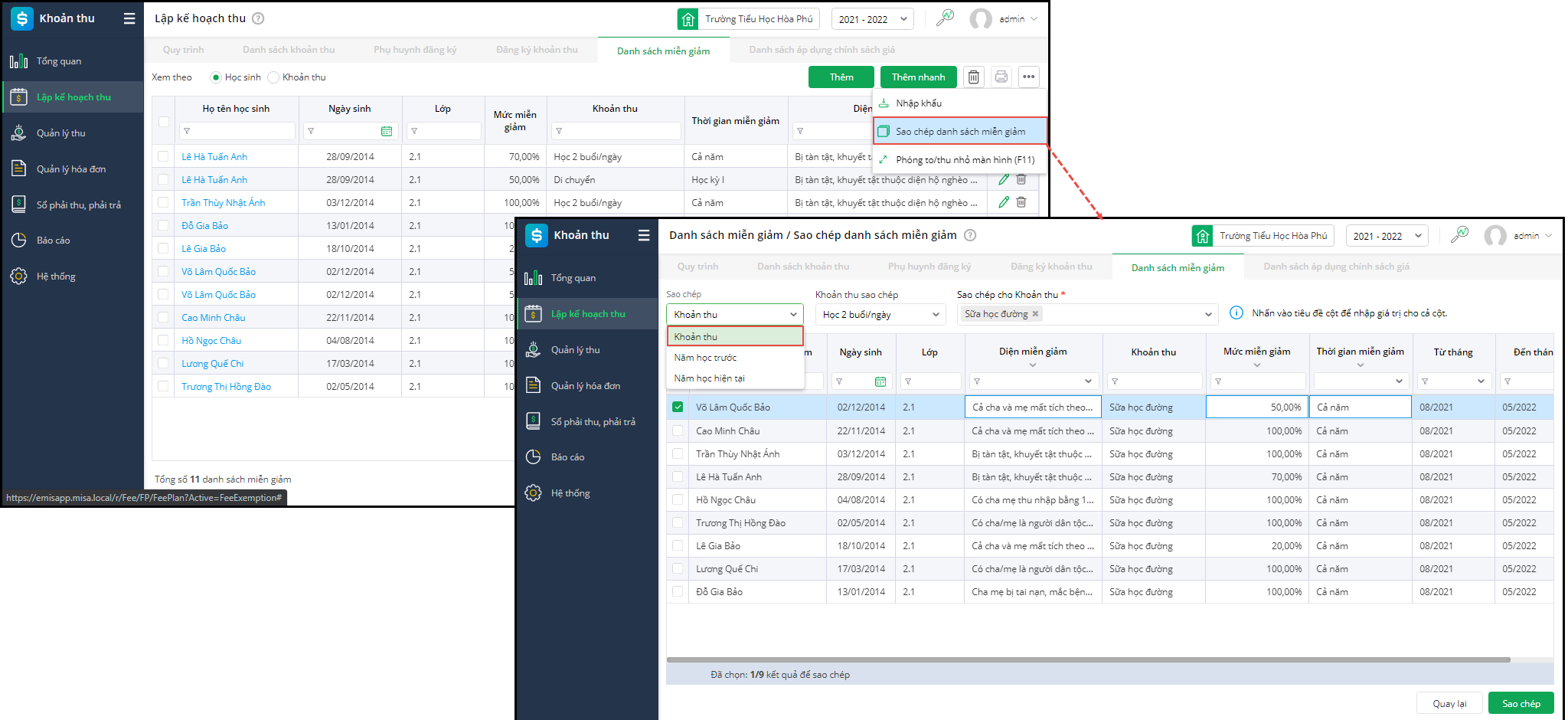 - Nhấn Sao chép để sao chép danh sách học sinh đã chọn với mức miễn giảm tương ứng.