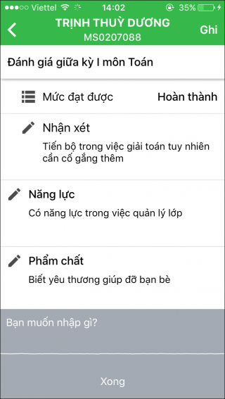 - Chạm vào Mức đạt được, chọn: Tốt, Hoàn thành, Chưa hoàn thành.