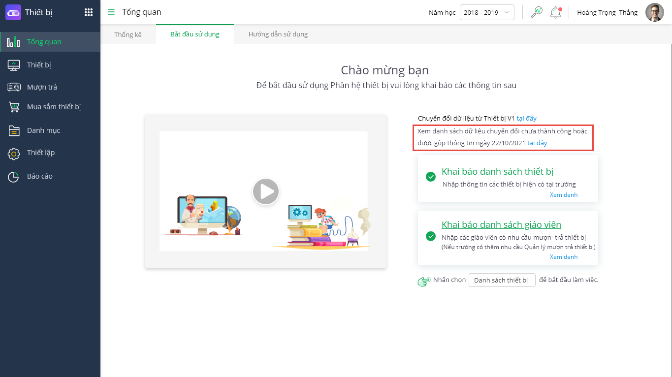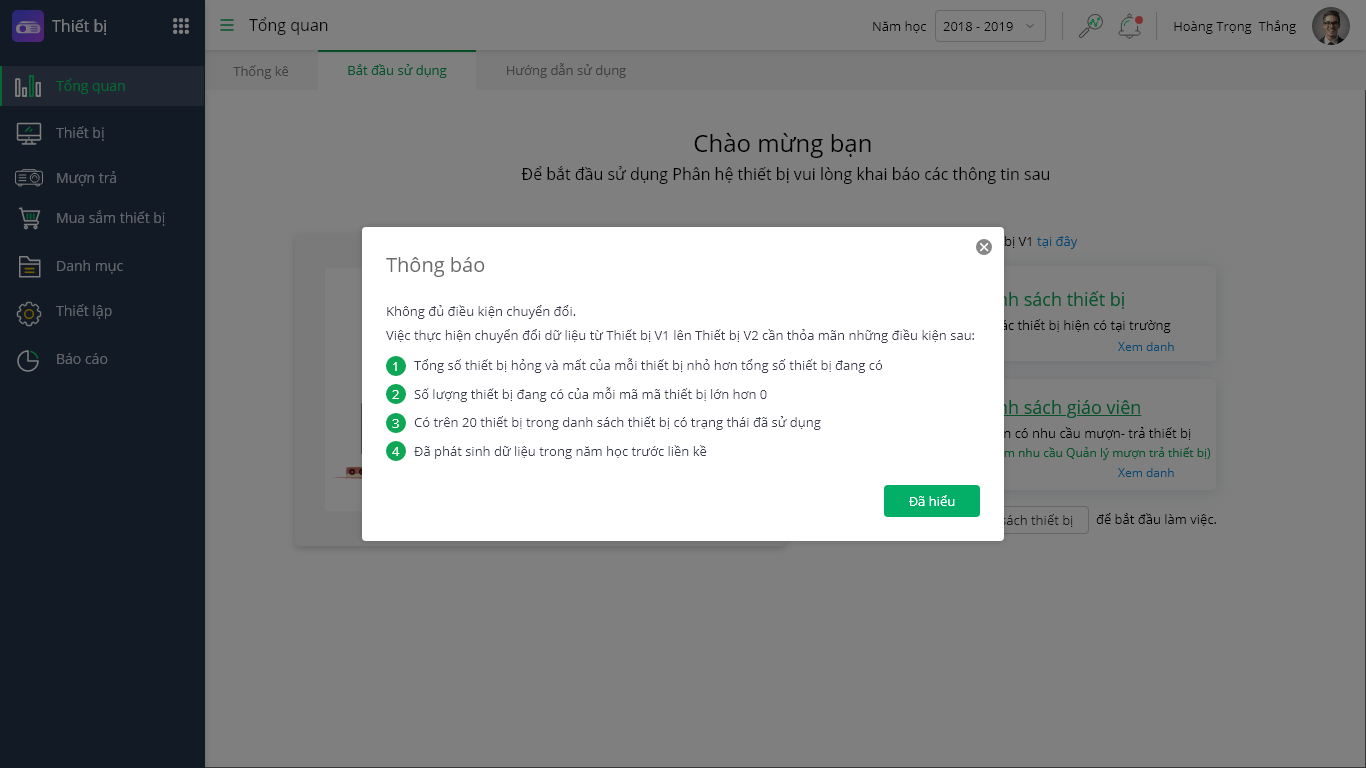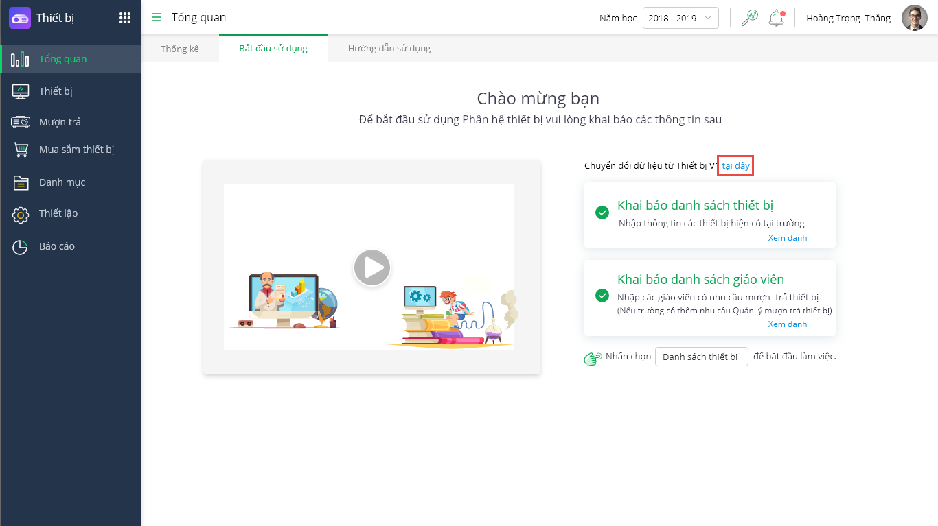 - Để thực hiện chuyển đổi dữ liệu thiết bị đang quản lý trên phiên bản Thiết bị V1 lên V2, tại màn hình Bắt đầu sử dụng, nhấn vào Tại đây.