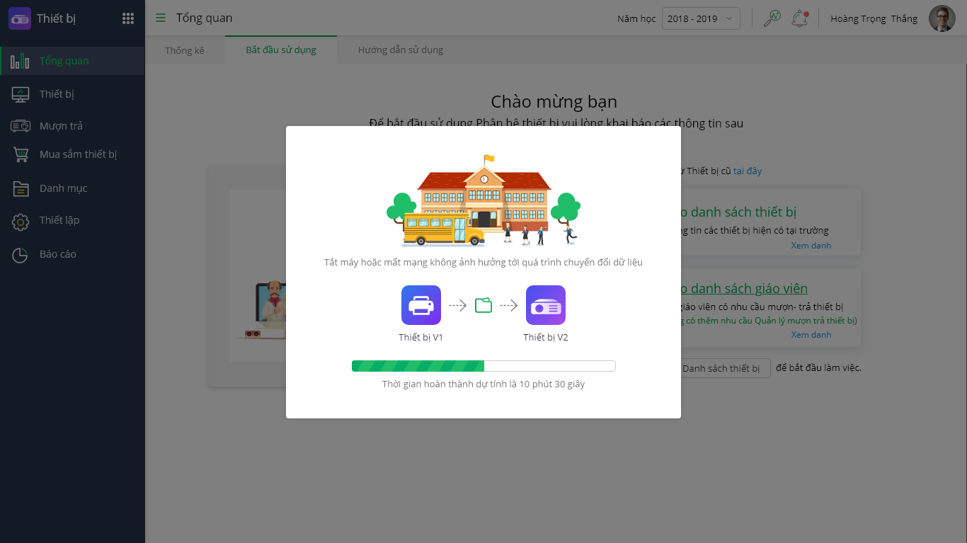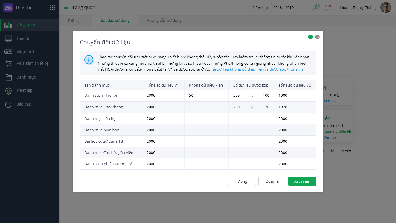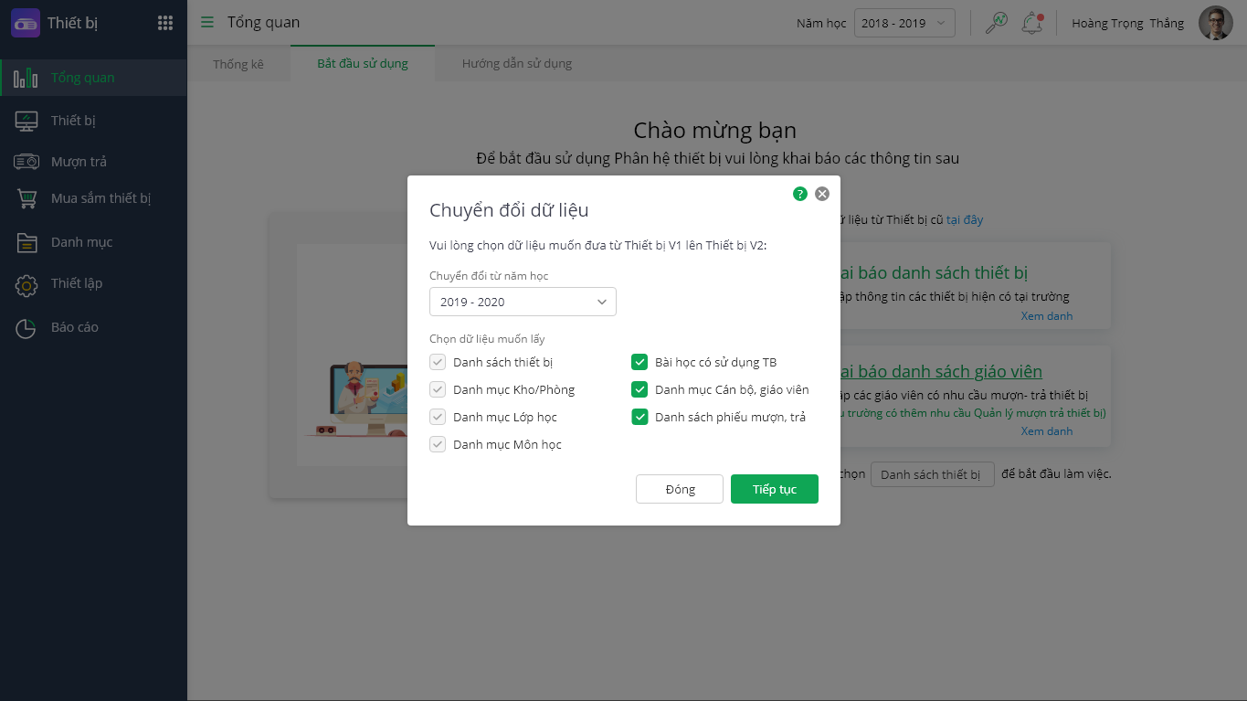 - Chọn dữ liệu muốn lấy từ phiên bản V1 lên phiên bản V2. Các dữ liệu Danh sách thiết bị, Danh mục kho phòng, Danh mục lớp học, Danh mục môn học được mặc định lấy lên.