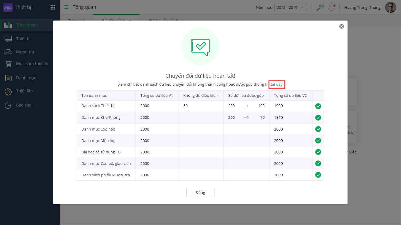 Nhấn vào Tại đây để kiểm tra danh sách dữ liệu chuyển đổi không thành công và các thiết bị đã gộp số hiệu thiết bị. - Sau khi chuyển đổi, anh/chị có thể xem lại danh sách dữ liệu chuyển đổi chưa thành công sau của lần chuyển đổi dữ liệu gần nhất.