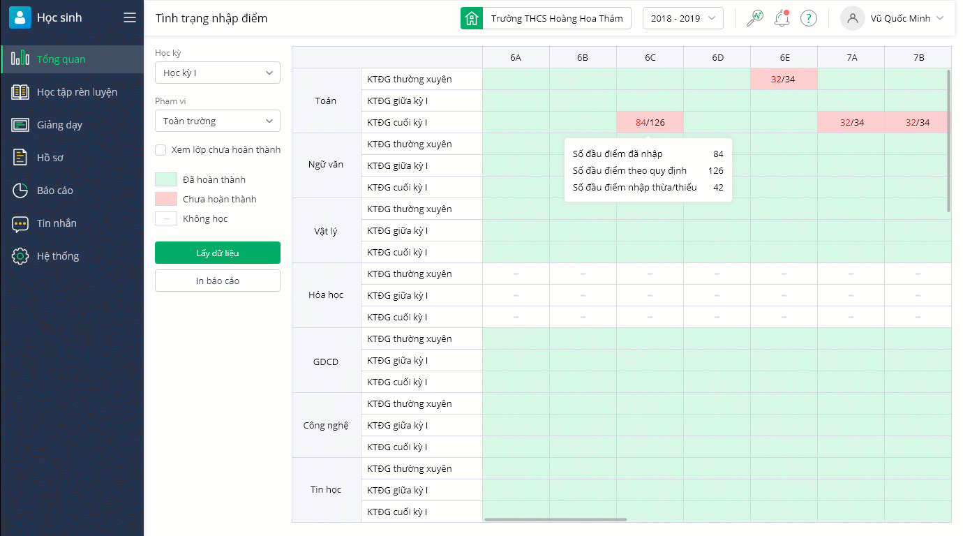 Tại đây, anh chị có thể theo dõi được tình trạng nhập điểm cho học sinh của giáo viên.