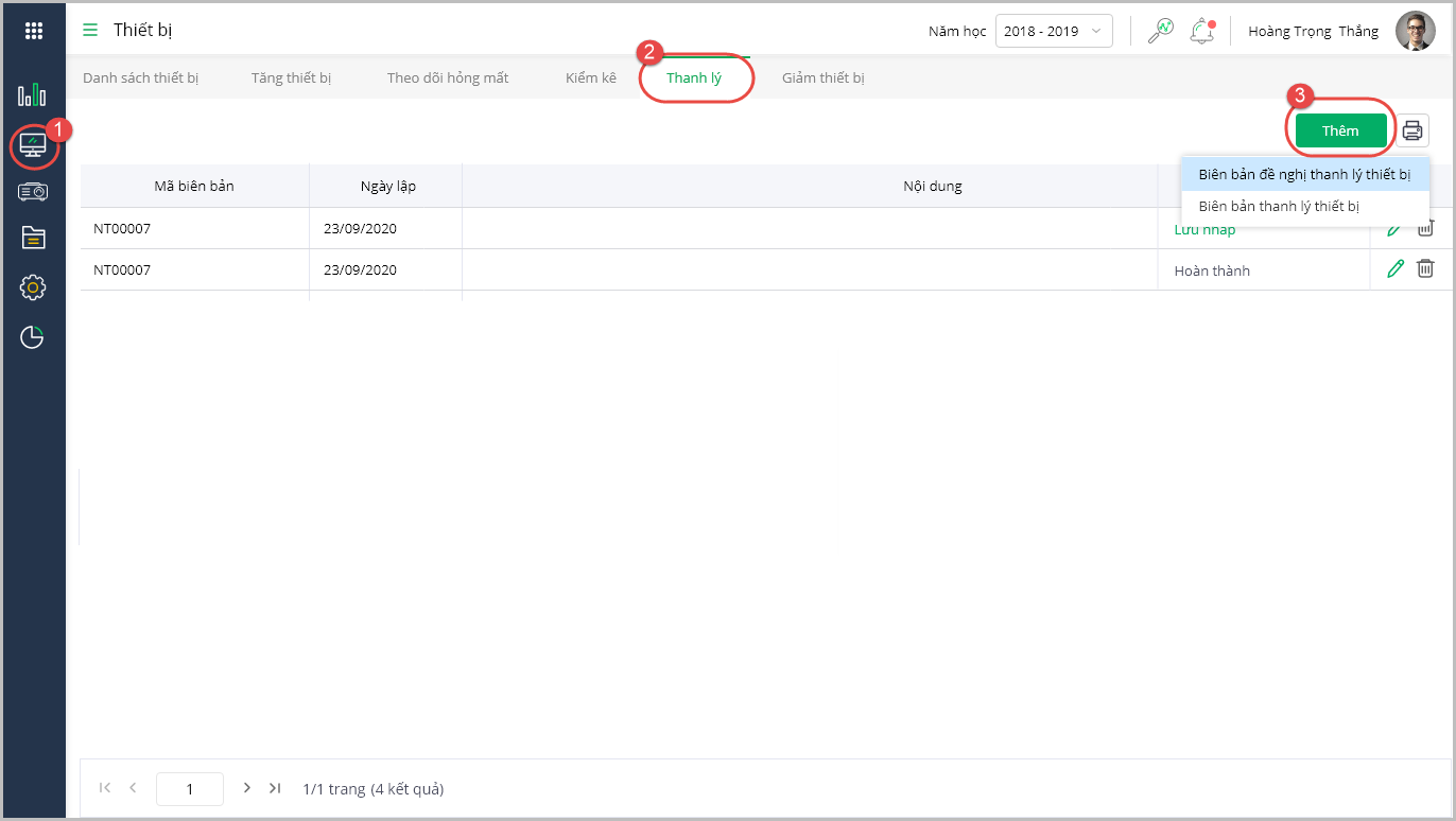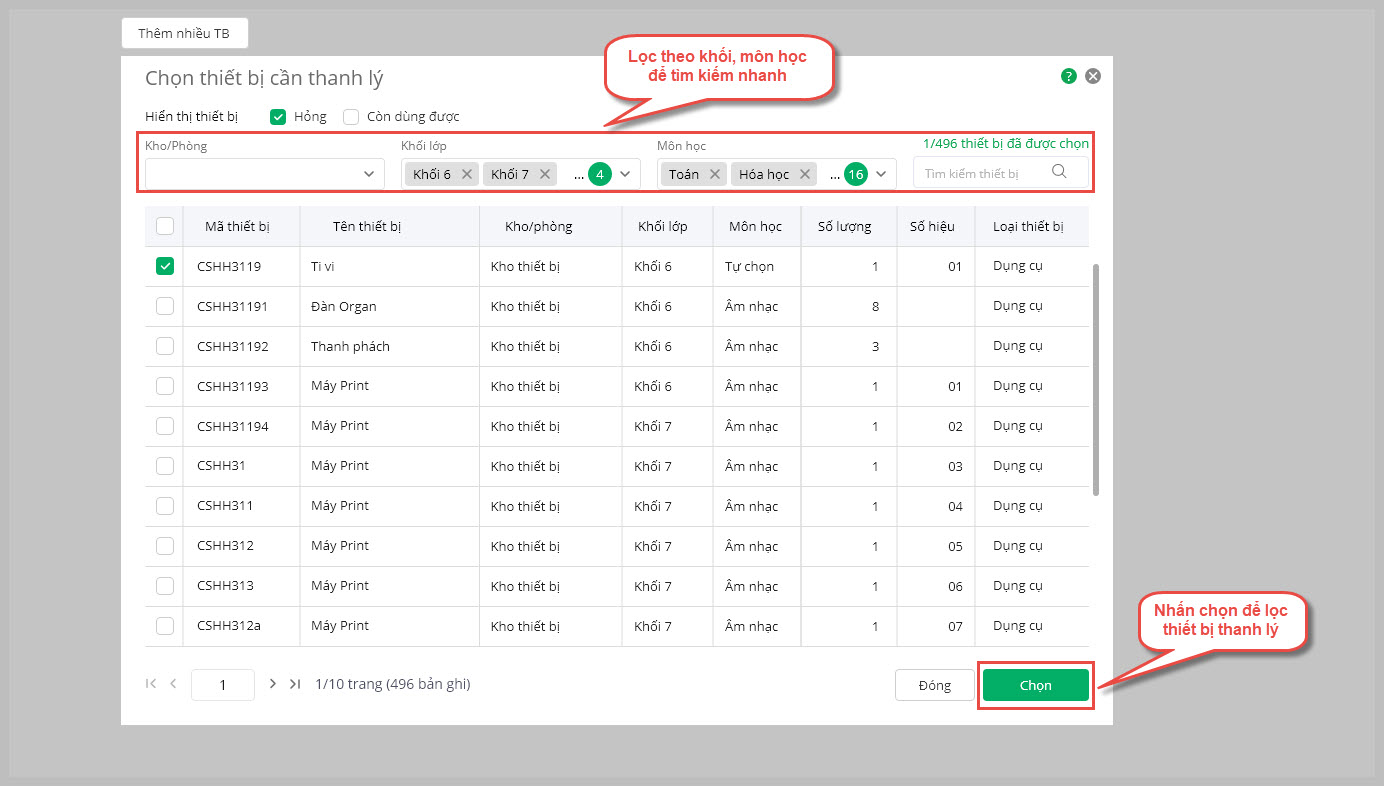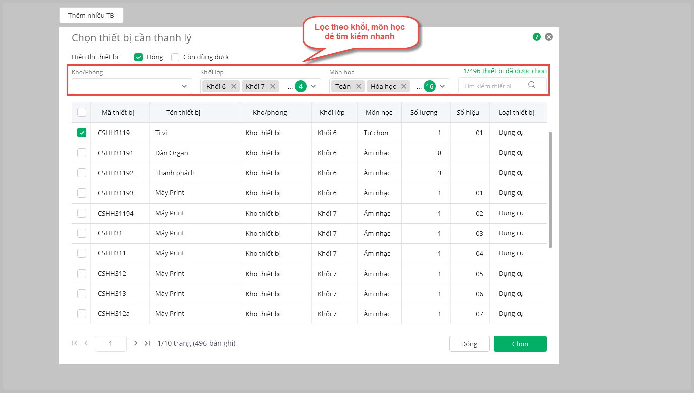 Từ phiên bản R124: Cán bộ thiết bị có thể lọc nhanh được khối lớp, trong phần thanh lý để chọn thiết bị nhanh chóng hơn.