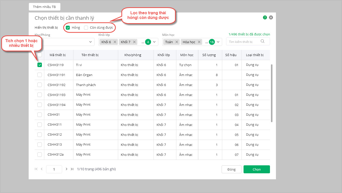 1. Trên phân hệ Thiết bị, anh chị chọn Thiết bị\Thanh lý\Thêm\Thêm nhiều thiết bị để tiến hành lọc nhanh được khối lớp để chọn thiết bị thanh lý nhanh hơn.
