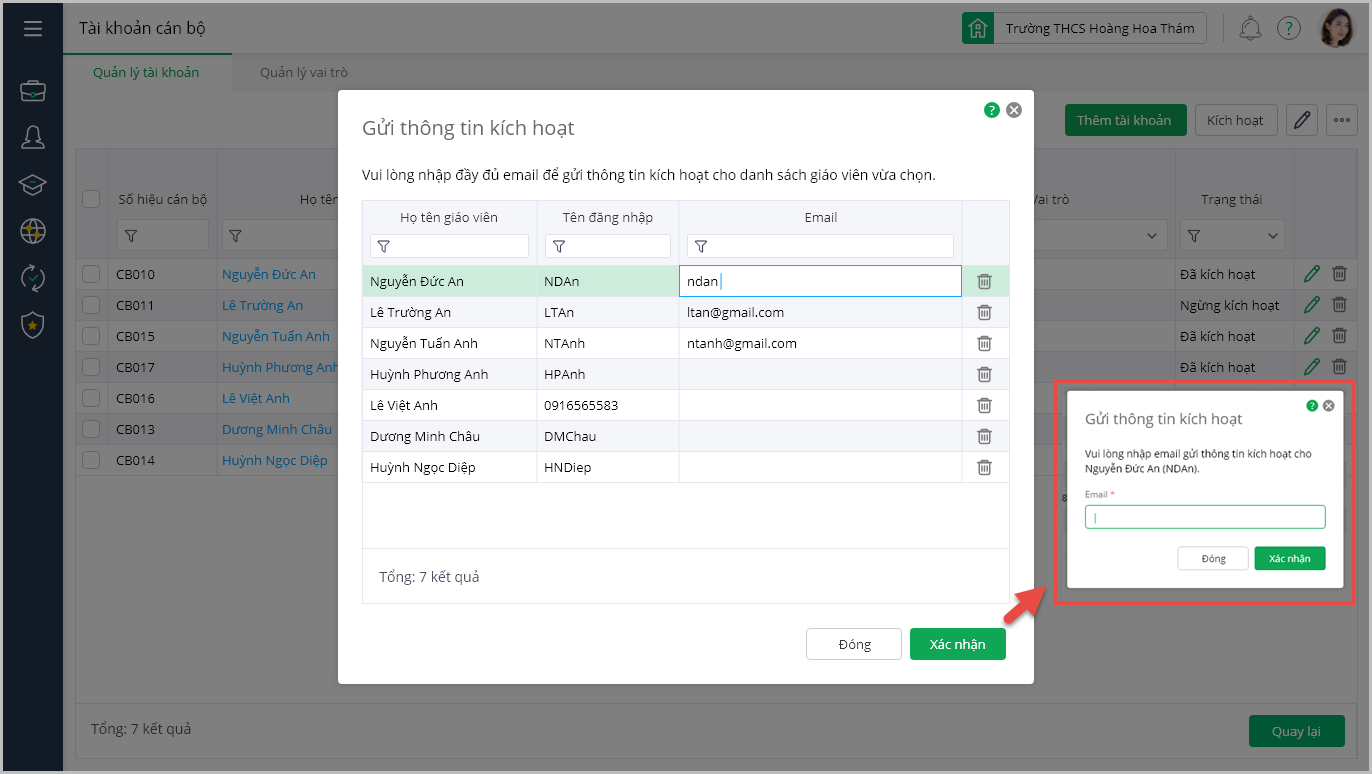 Anh chị chọn giáo viên, gửi thông tin kích hoạt.