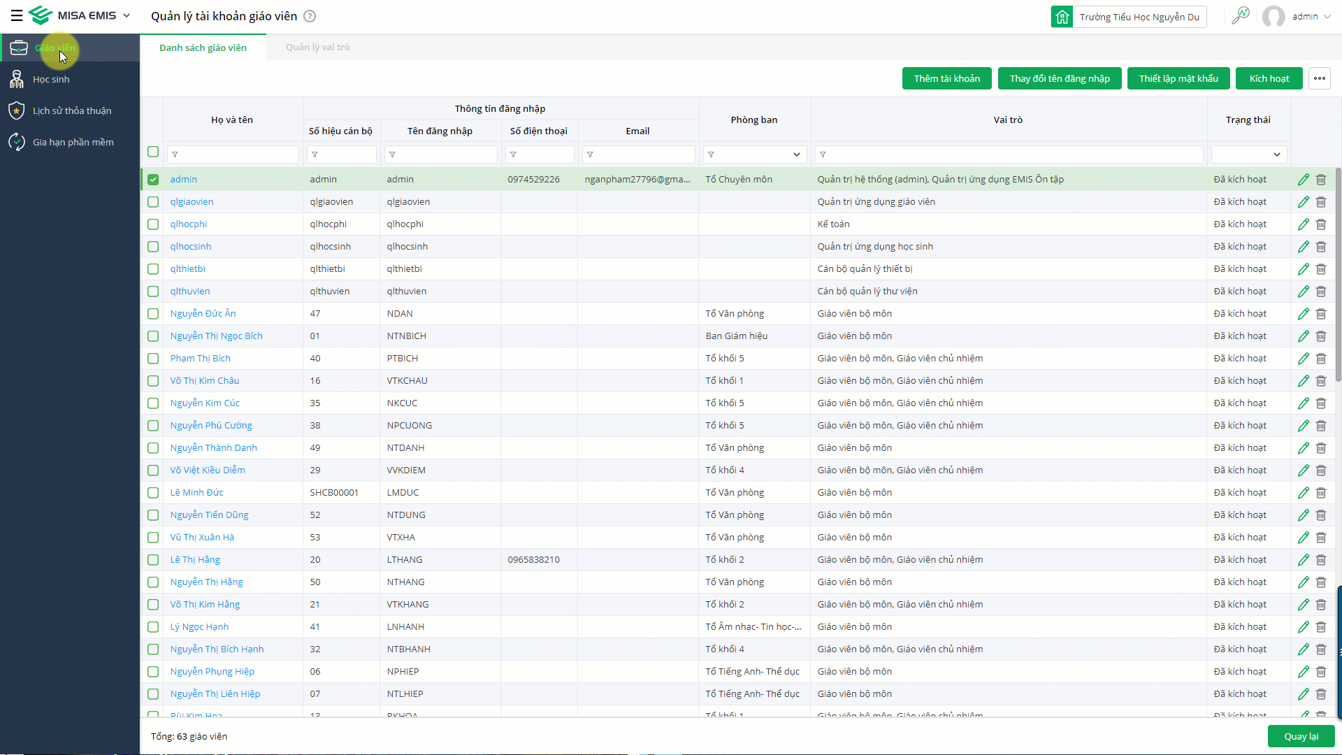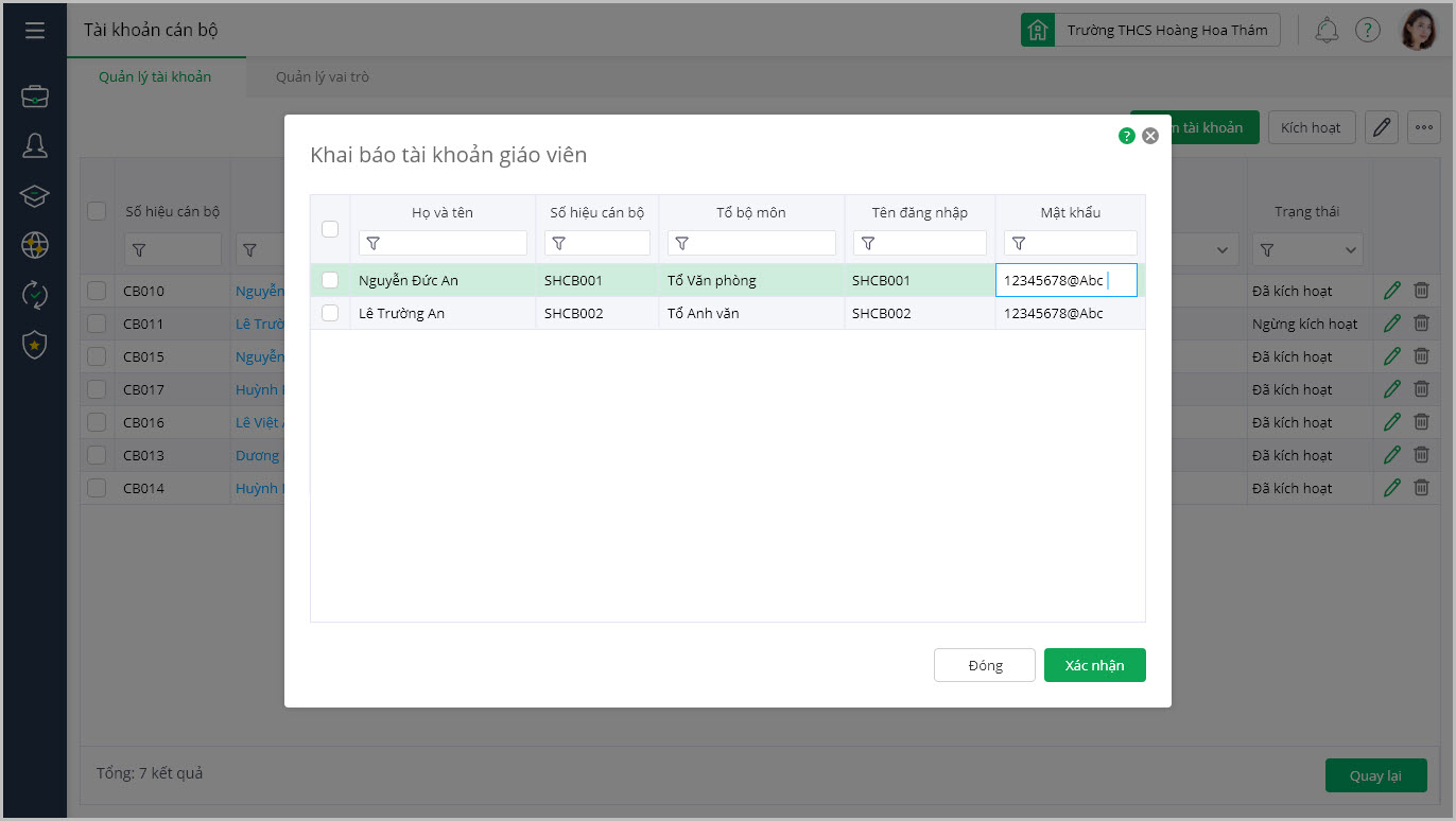 Tại đây phần mềm sẽ tự động lấy lên danh sách giáo viên chưa có tài khoản. Để khai báo tài khoản, cán bộ trường học tích chọn giáo viên muốn khai báo tài khoản, mật khẩu hoặc cả hai.