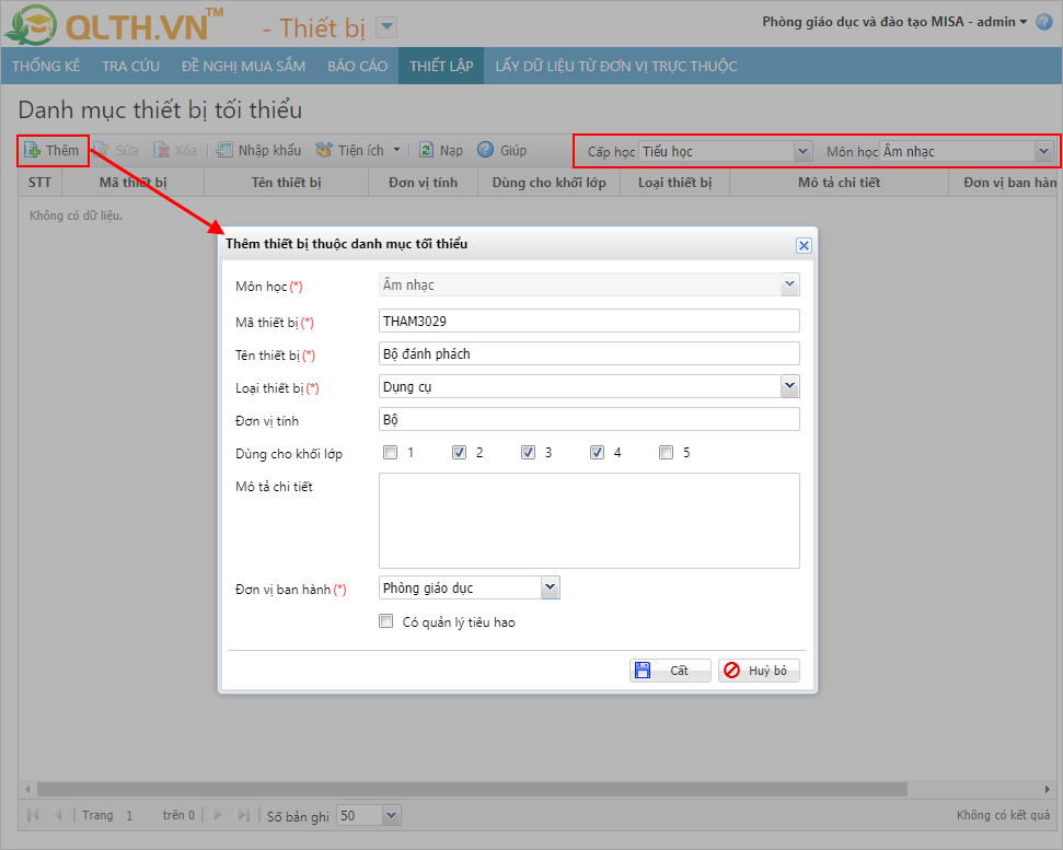 Lưu ý: Trong trường hợp muốn thêm danh mục thiết bị tối thiểu dùng chung cho tất cả các cấp thì anh/chị lựa chọn Cấp học là Tất cả.
