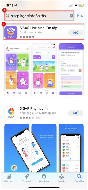 - Đối với anh chị dùng điện thoại hệ điều hành IOS như Iphone anh chị lên Appstore để tải ứng dụng SISAP Học sinh: Ôn tập.