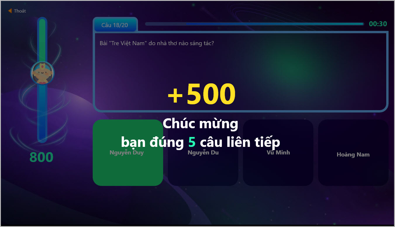 Khi học sinh trả lời đúng liên tục 5 câu hỏi sẽ được cộng thêm điểm.