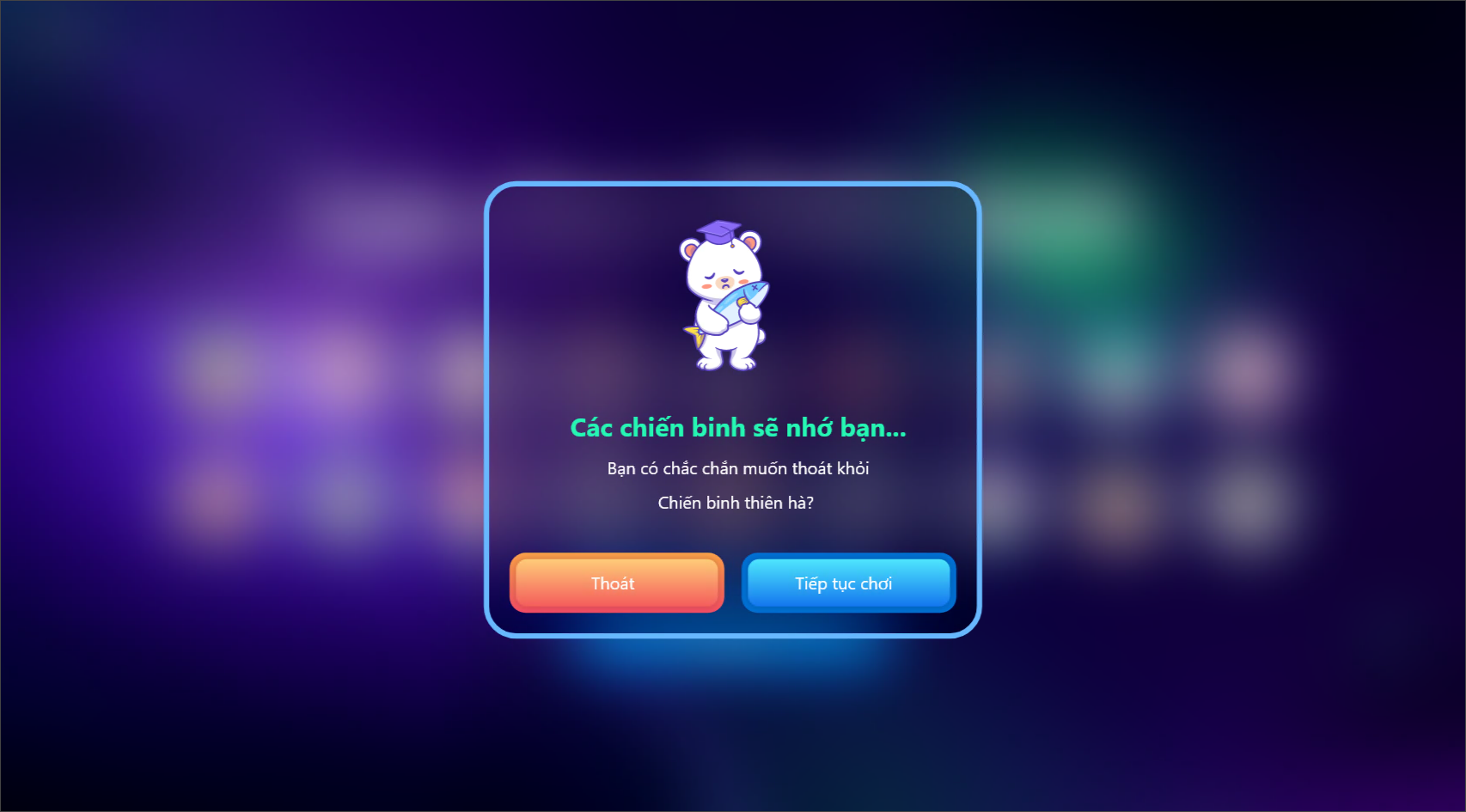 Khi chơi game, nếu muốn thoát, chương trình sẽ hiện lên thông báo để học sinh chọn Tiếp tục chơi hoặc Thoát.